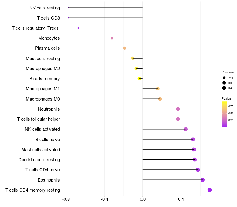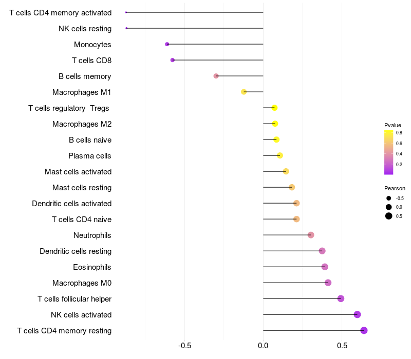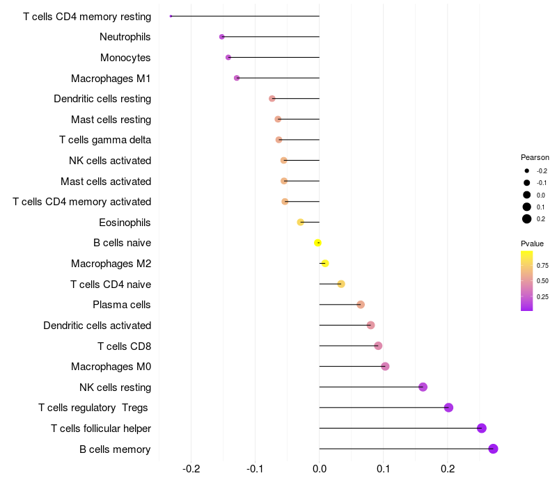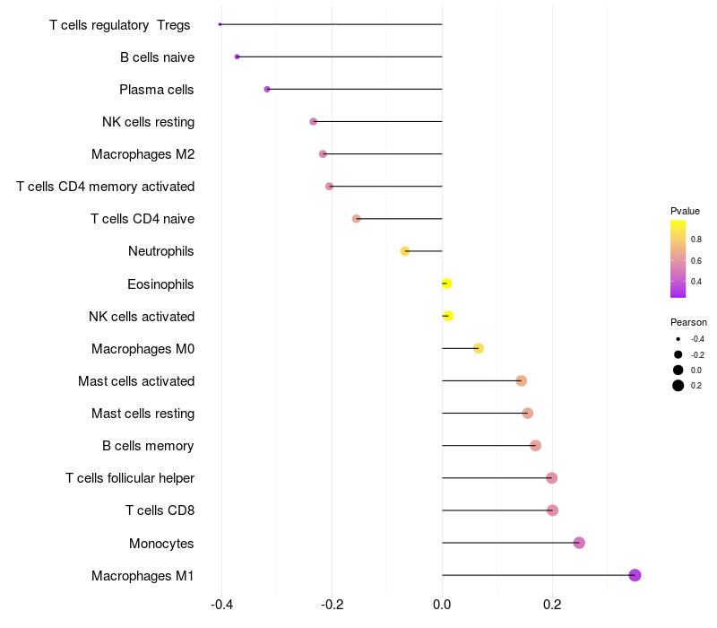 Lollipop of RPS9 expression and immune infiltrating cell level correlation result in HBV+ Liver cirrhosis samples