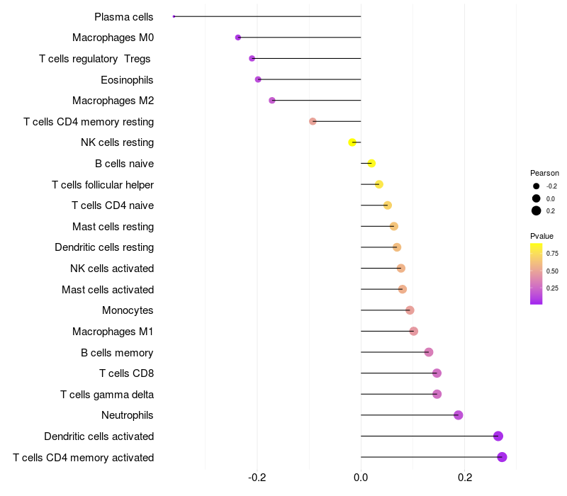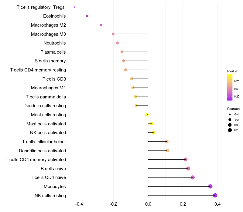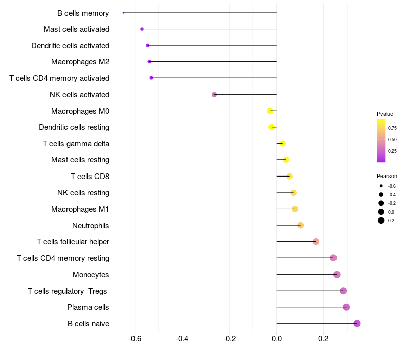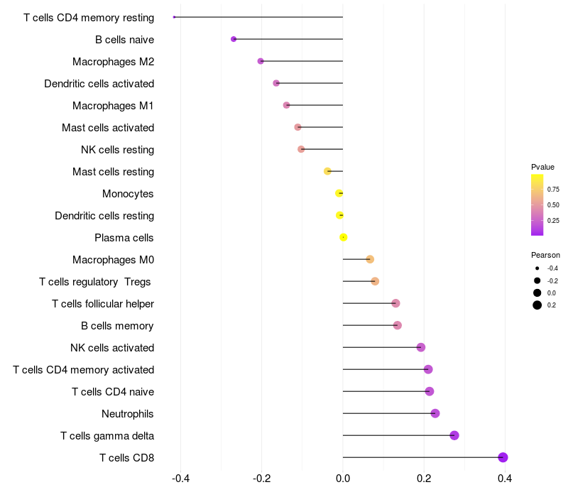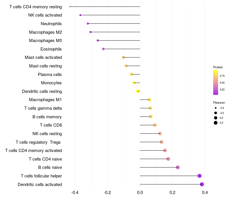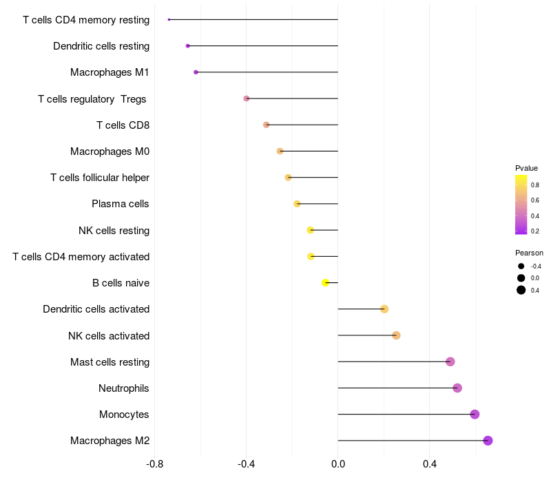 Lollipop of RRP8 expression and immune infiltrating cell level correlation result in HPV+ samples