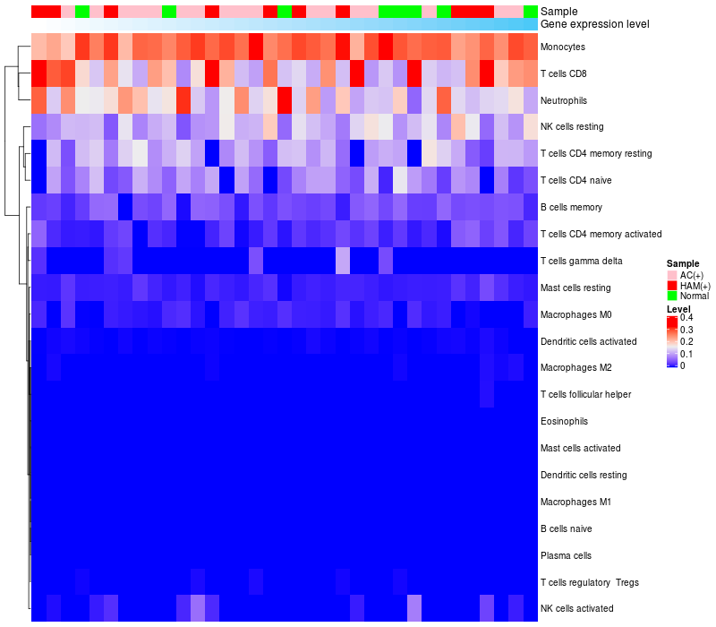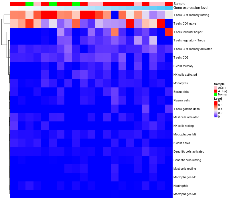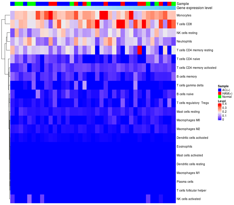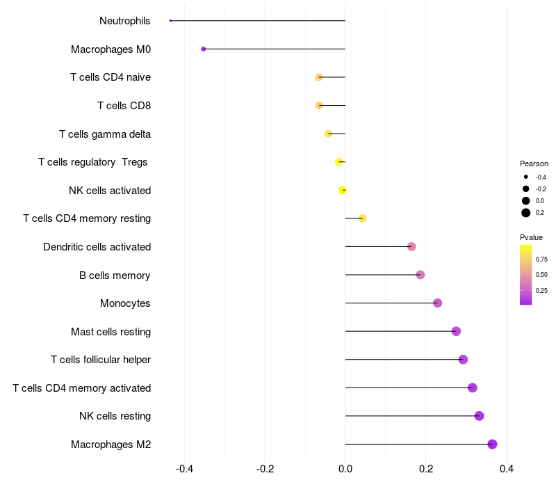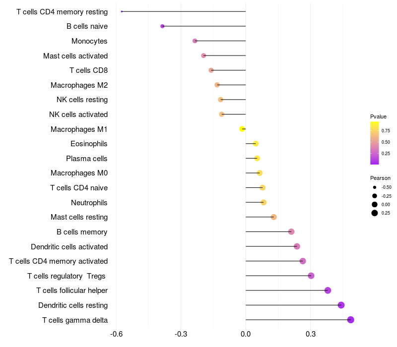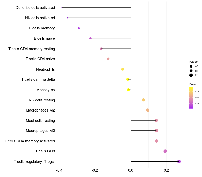 Lollipop of RSPO3 expression and immune infiltrating cell level correlation result in HTLV1+ samples