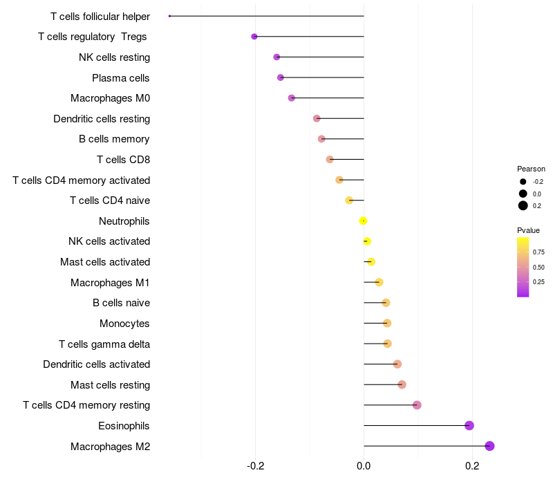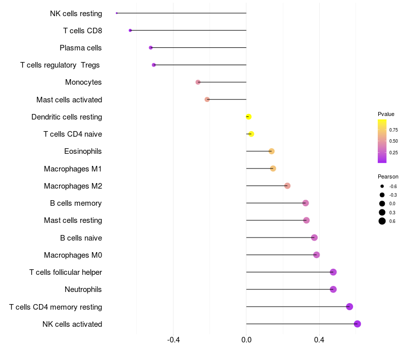 Lollipop of RSPRY1 expression and immune infiltrating cell level correlation result in HBV+ Chronic HBV (CHB) infection samples
