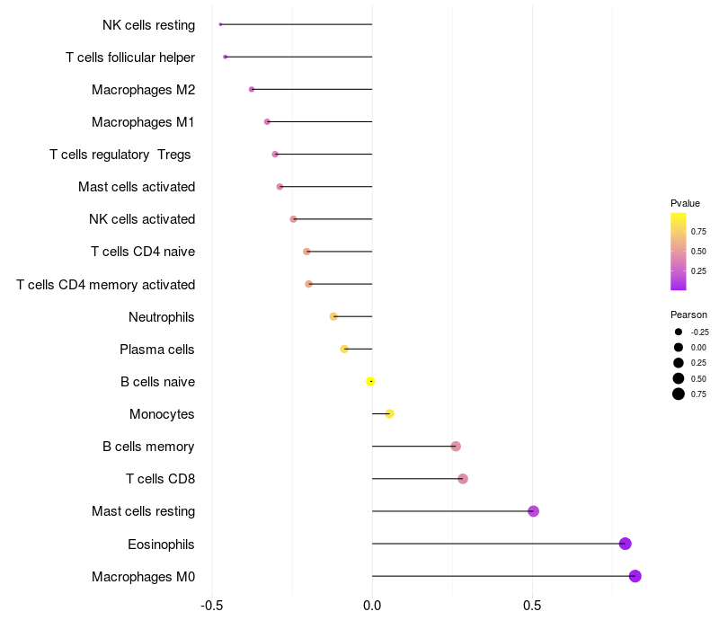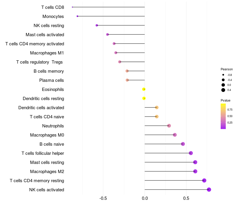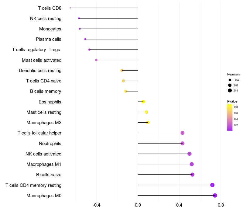 Lollipop of RTTN expression and immune infiltrating cell level correlation result in HBV+ Liver cirrhosis samples