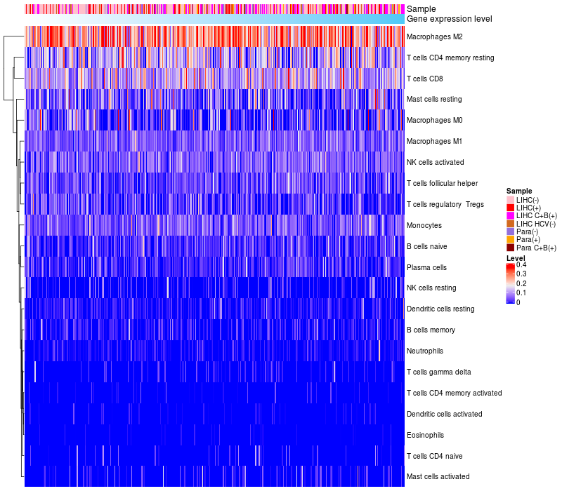Liver hepatocellular carcinoma HCV (HBV+)(86), Liver hepatocellular carcinoma HCV (HBV-)(19), Liver hepatocellular carcinoma (HBV+)(209), Liver hepatocellular carcinoma (HBV+)(60), Paracancerous HCV (HBV+)(4), Paracancerous (HBV-)(28), Paracancerous (HBV+)(18) |