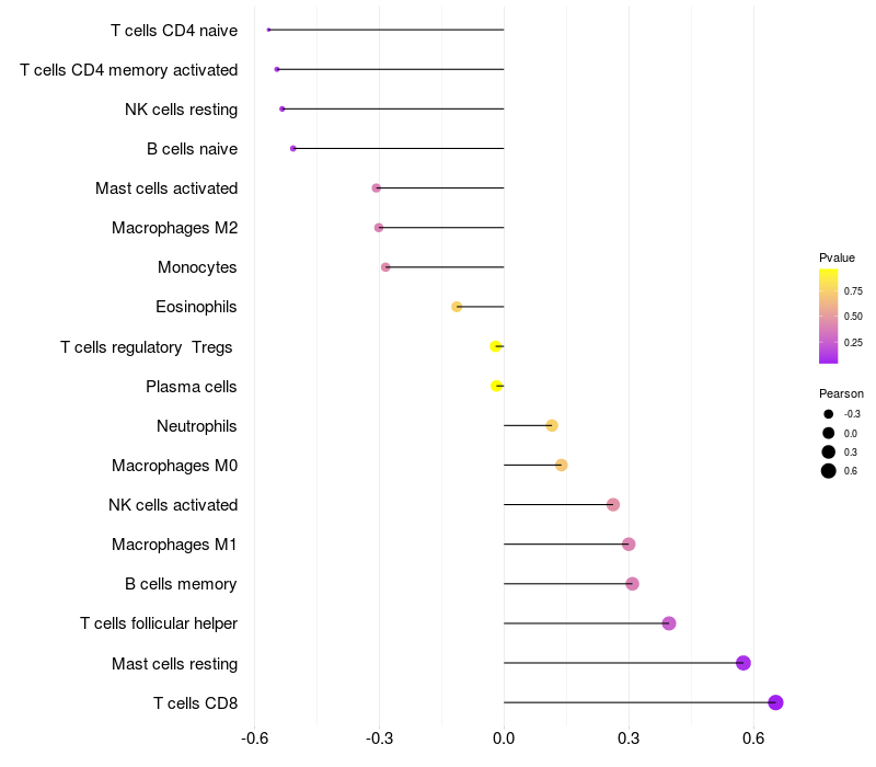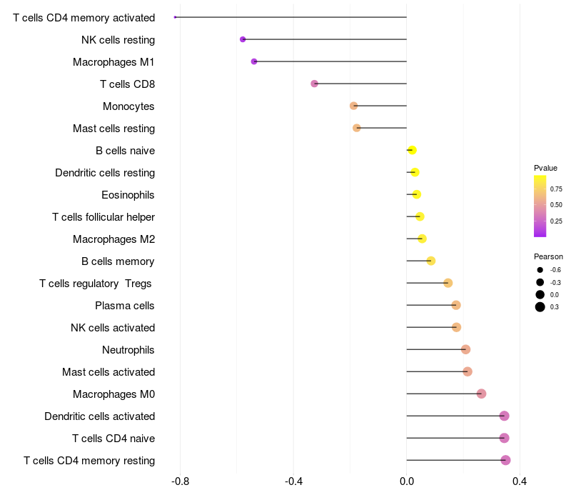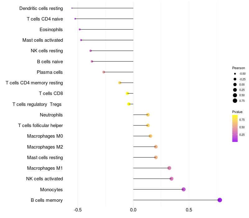 Lollipop of RUFY2 expression and immune infiltrating cell level correlation result in HBV+ Chronic HBV (CHB) infection samples