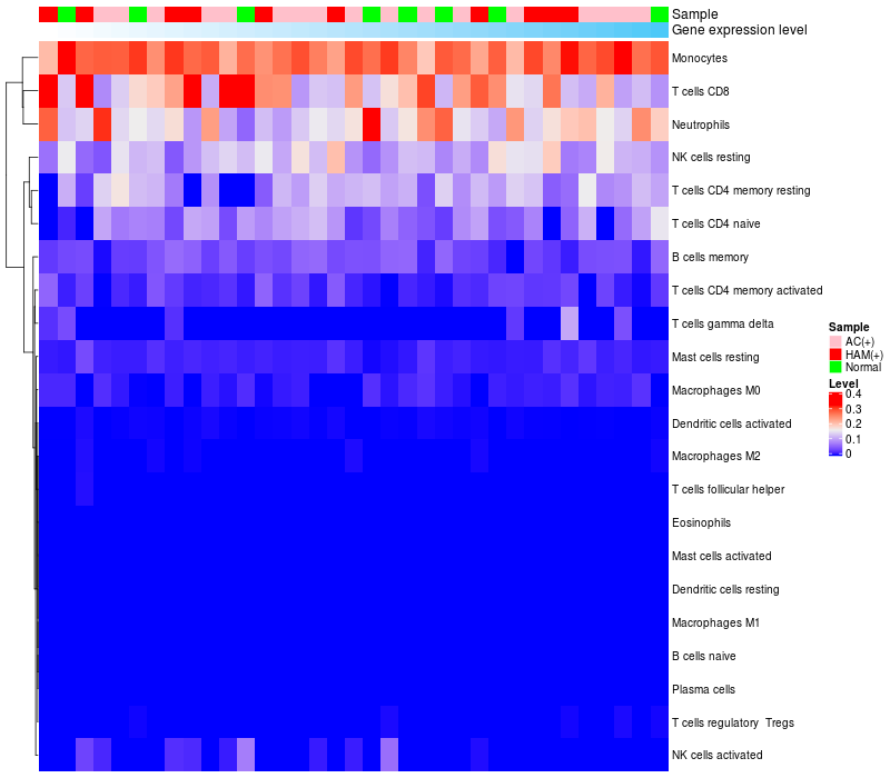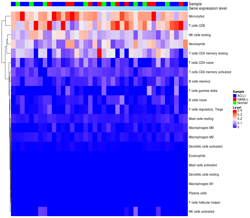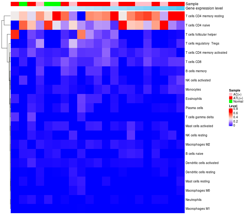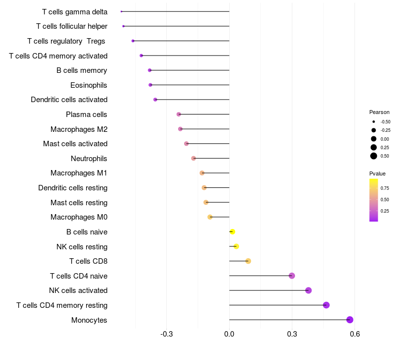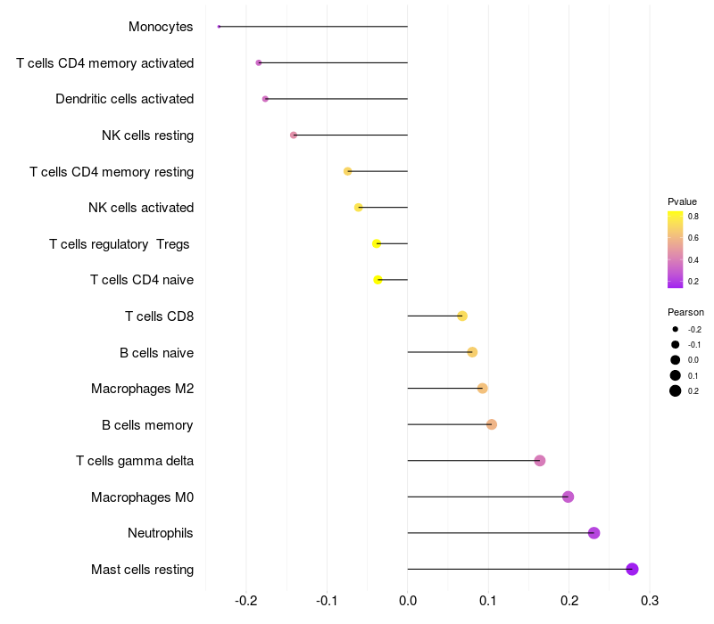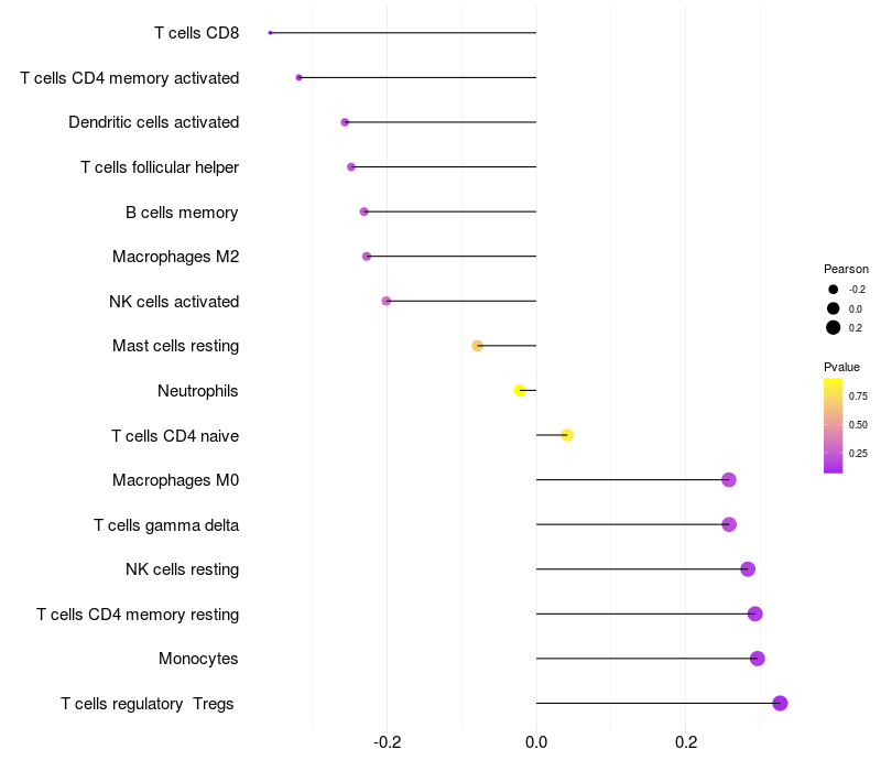 Lollipop of RUSC2 expression and immune infiltrating cell level correlation result in HTLV1+ samples
