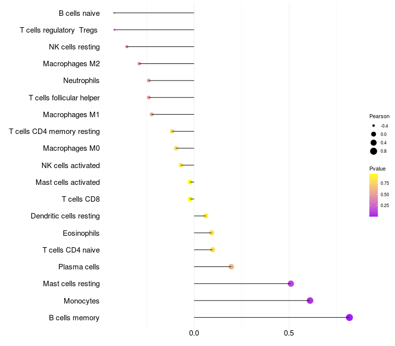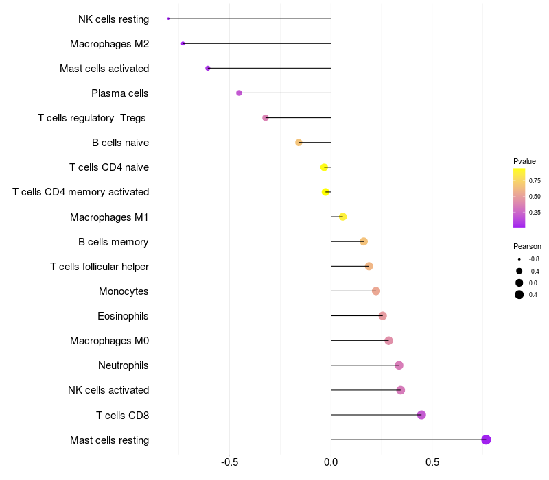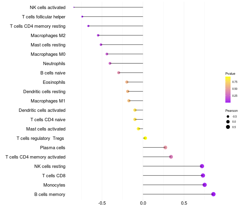 Lollipop of RYBP expression and immune infiltrating cell level correlation result in HBV+ Chronic HBV (CHB) infection samples