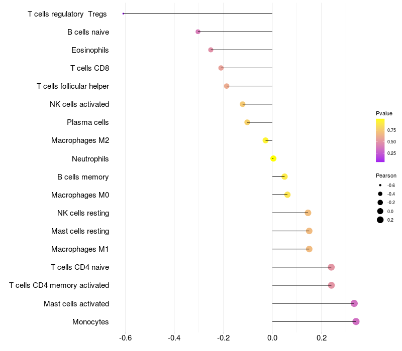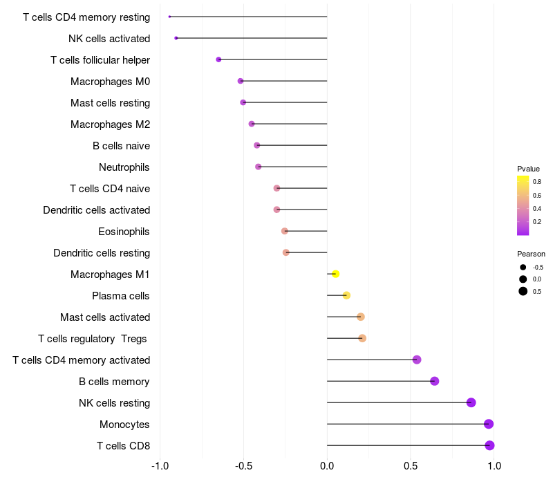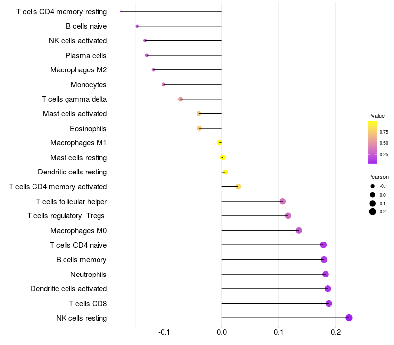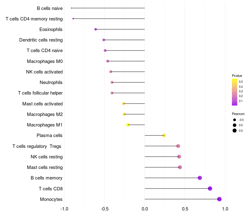 Lollipop of S100A9 expression and immune infiltrating cell level correlation result in HBV+ Liver cirrhosis samples