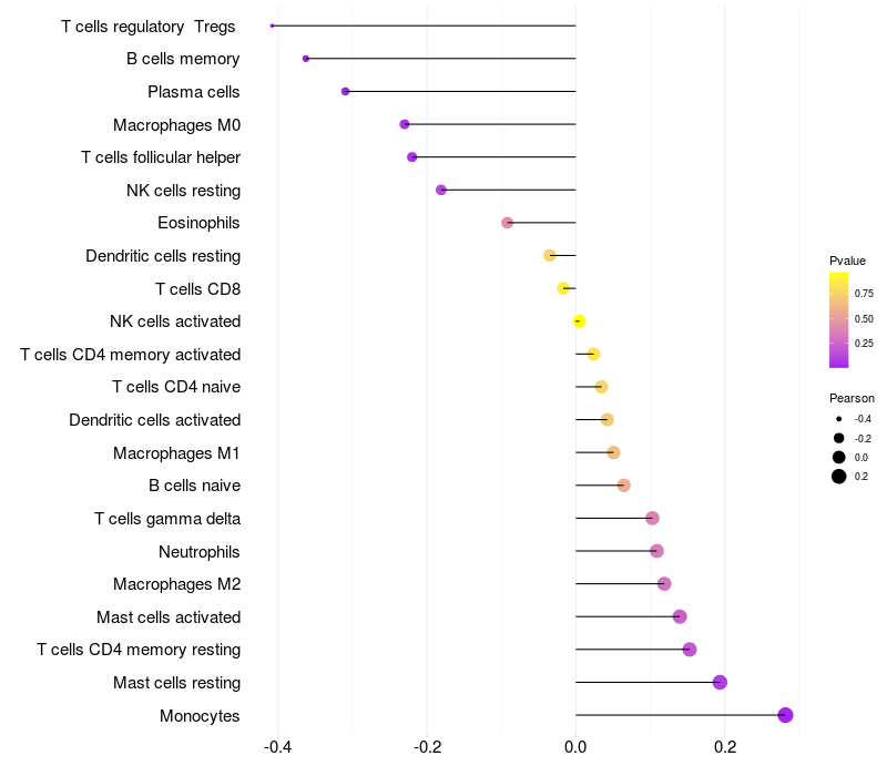Lollipop of SACM1L expression and immune infiltrating cell level correlation result in HBV+ Liver cirrhosis samples
