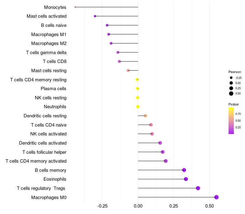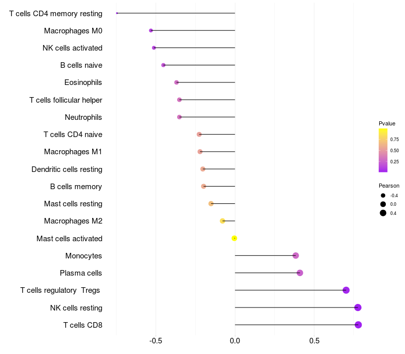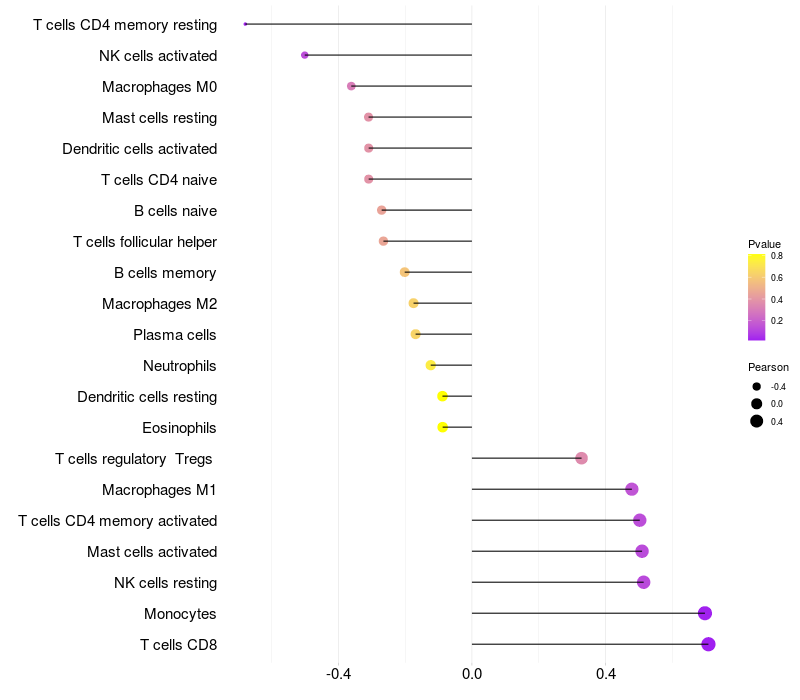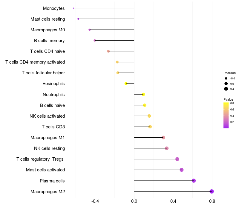 Lollipop of SAMD10 expression and immune infiltrating cell level correlation result in HBV+ Liver cirrhosis samples