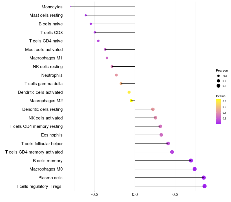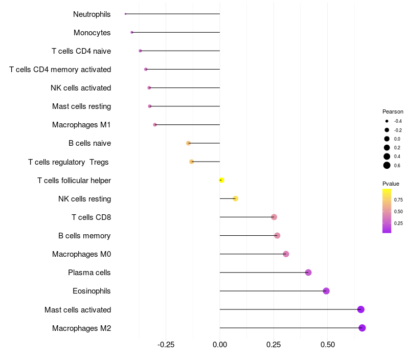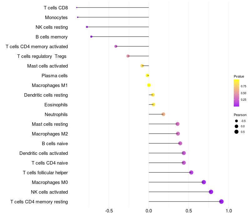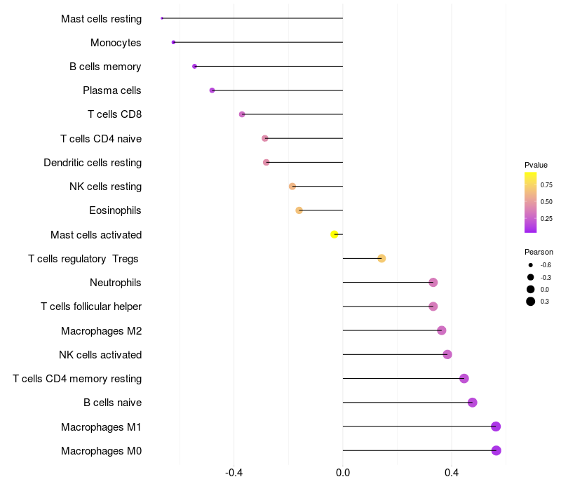 Lollipop of SCMH1 expression and immune infiltrating cell level correlation result in HBV+ Liver cirrhosis samples