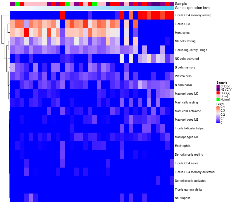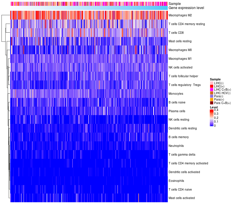 Liver hepatocellular carcinoma HCV (HBV+)(86), Liver hepatocellular carcinoma HCV (HBV-)(19), Liver hepatocellular carcinoma (HBV+)(209), Liver hepatocellular carcinoma (HBV+)(60), Paracancerous HCV (HBV+)(4), Paracancerous (HBV-)(28), Paracancerous (HBV+)(18) |
