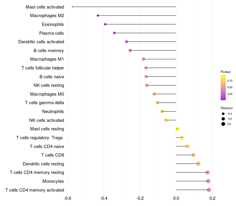Lollipop of SCN10A expression and immune infiltrating cell level correlation result in HTLV1+ samples
