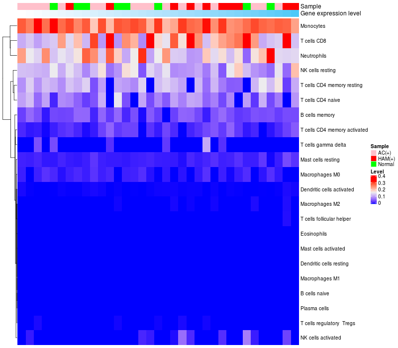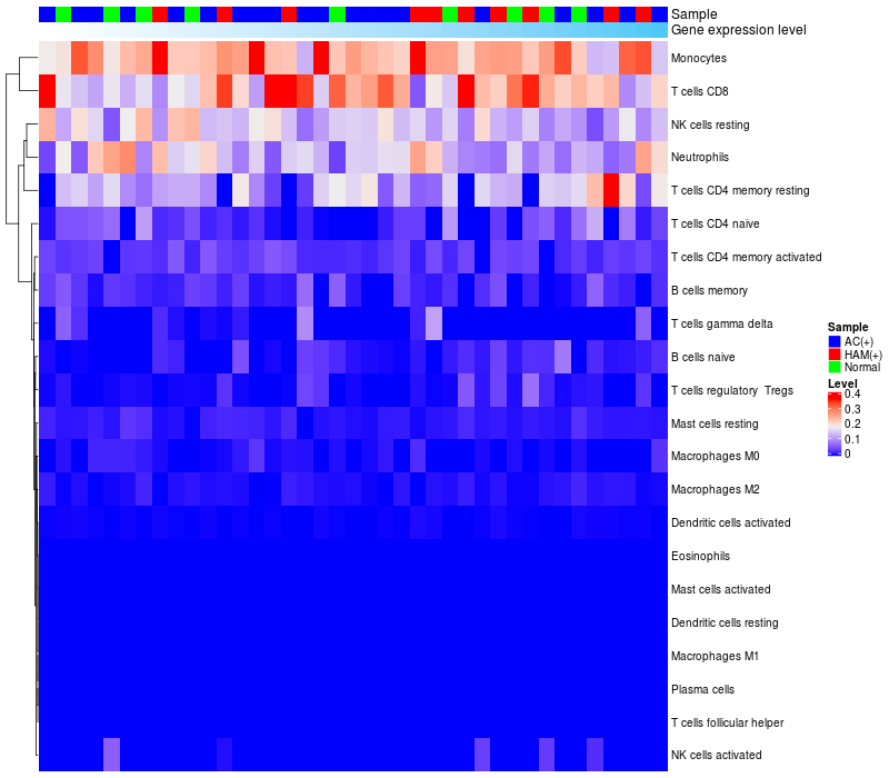 Normal (8), Asymptomatic carriers (HTLV1+)(17), HTLV-1-associated myelopathy (HTLV1+)(10) |