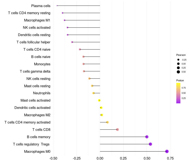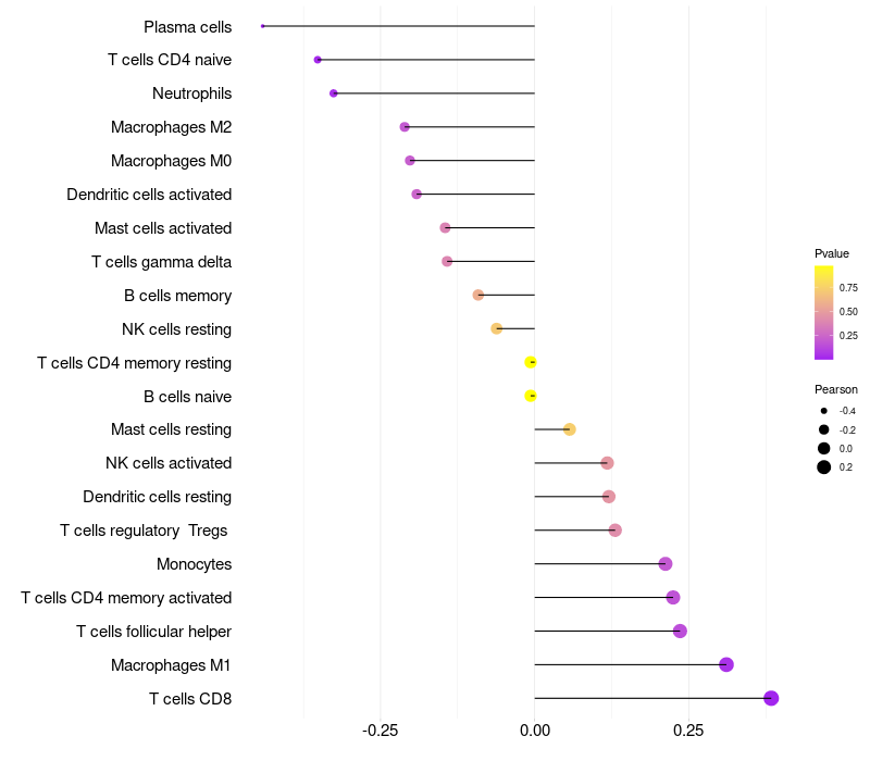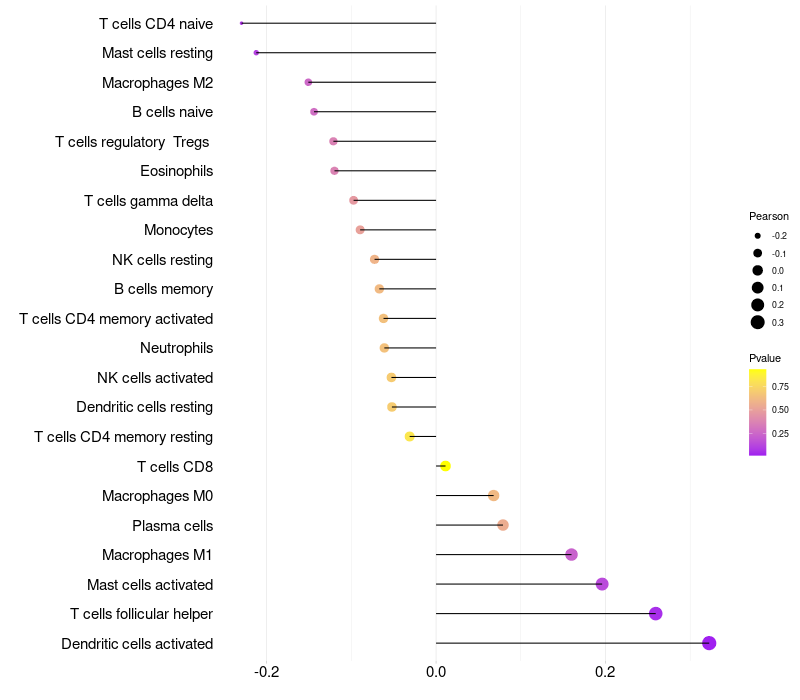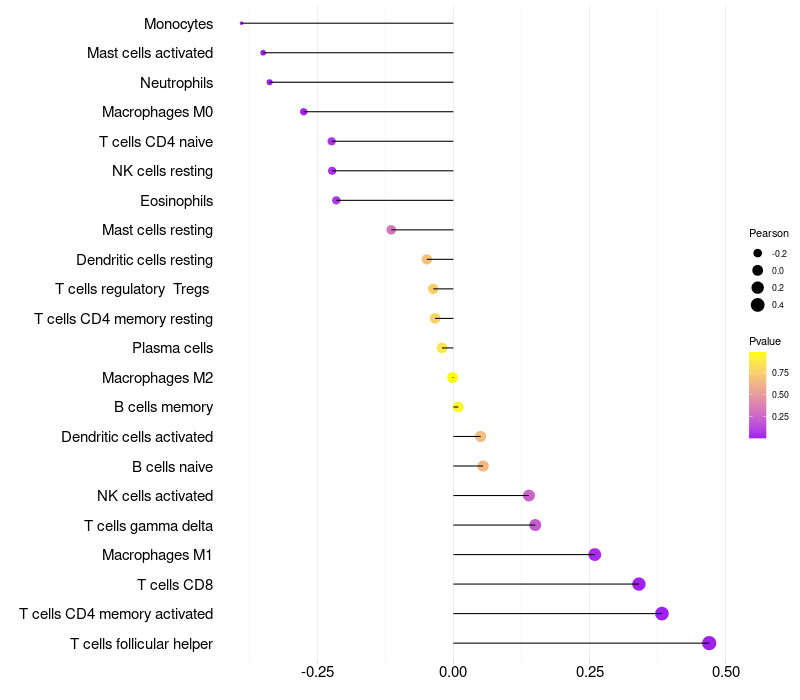Lollipop of SCPEP1 expression and immune infiltrating cell level correlation result in HPV+ samples