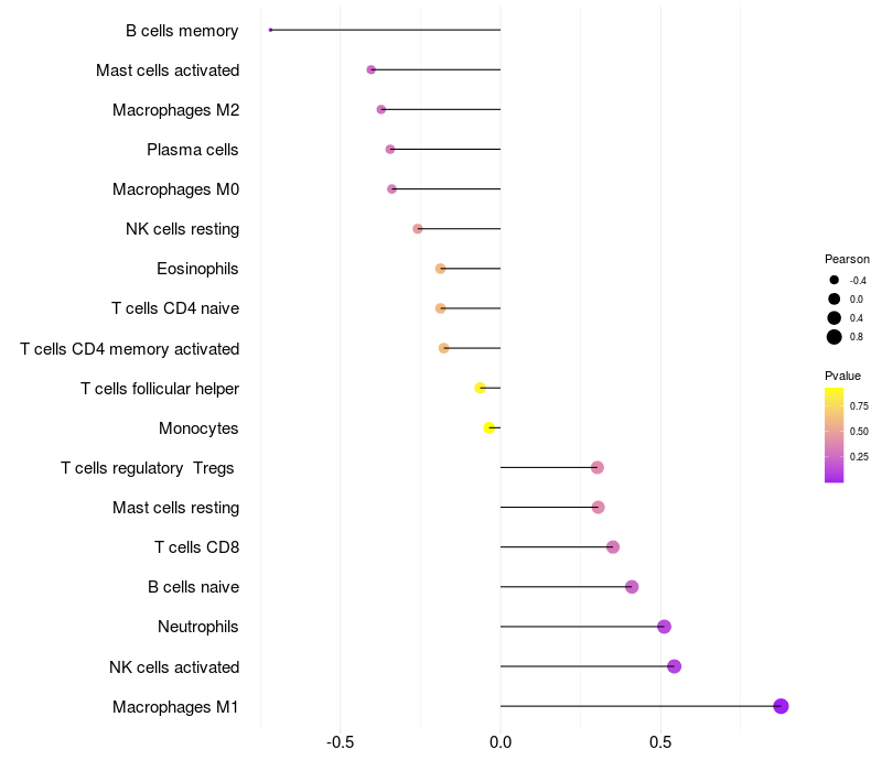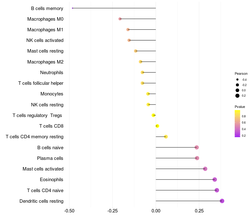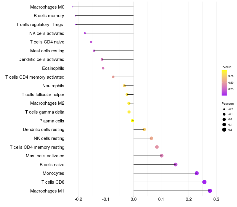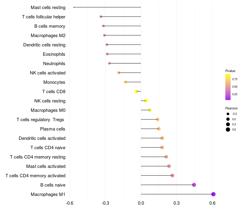 Lollipop of SDS expression and immune infiltrating cell level correlation result in HBV+ Liver cirrhosis samples