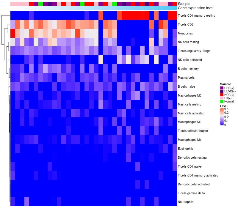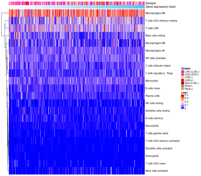 Liver hepatocellular carcinoma HCV (HBV+)(86), Liver hepatocellular carcinoma HCV (HBV-)(19), Liver hepatocellular carcinoma (HBV+)(209), Liver hepatocellular carcinoma (HBV+)(60), Paracancerous HCV (HBV+)(4), Paracancerous (HBV-)(28), Paracancerous (HBV+)(18) |
