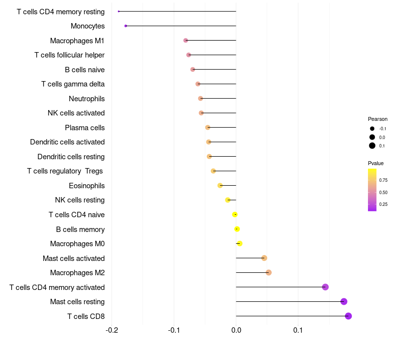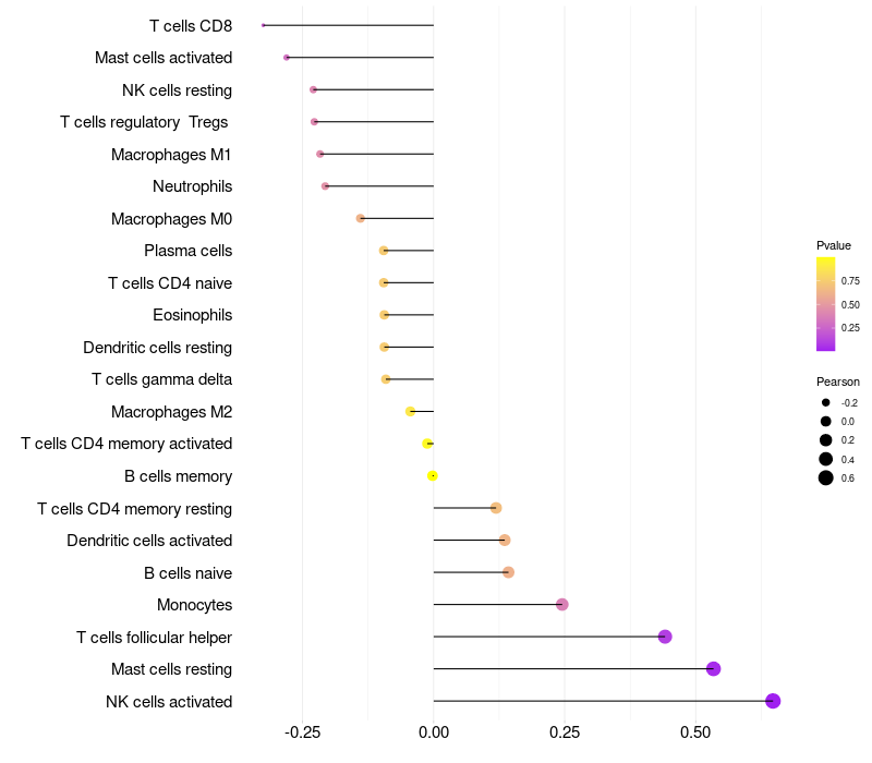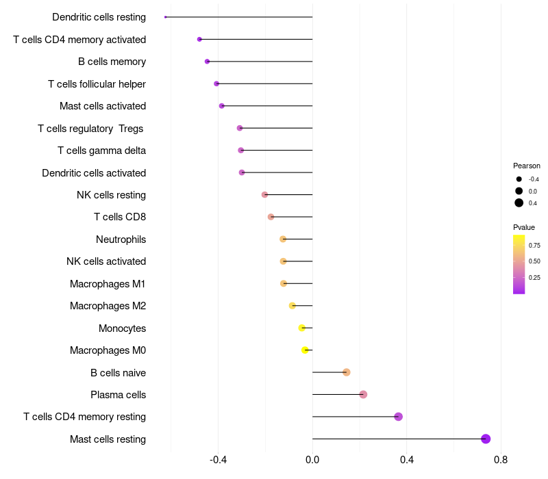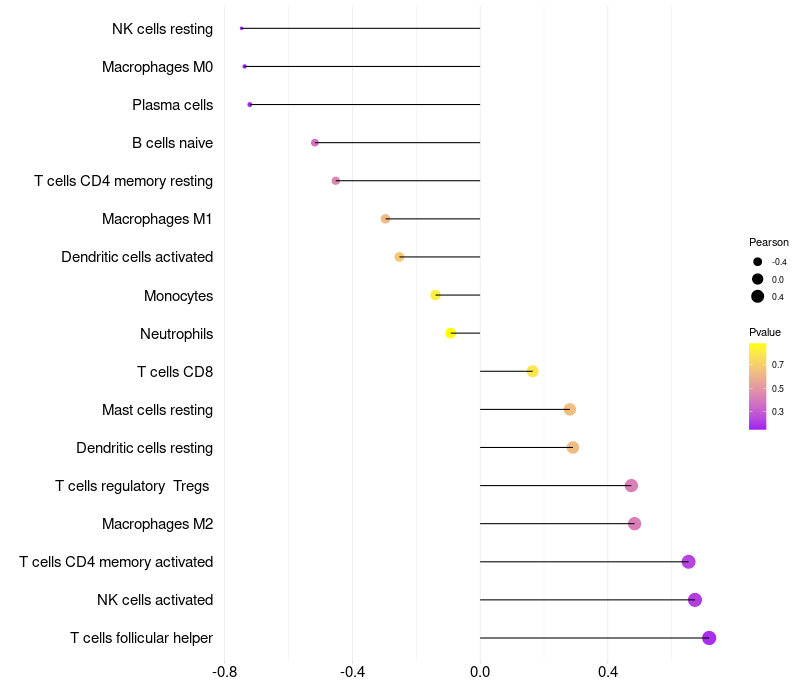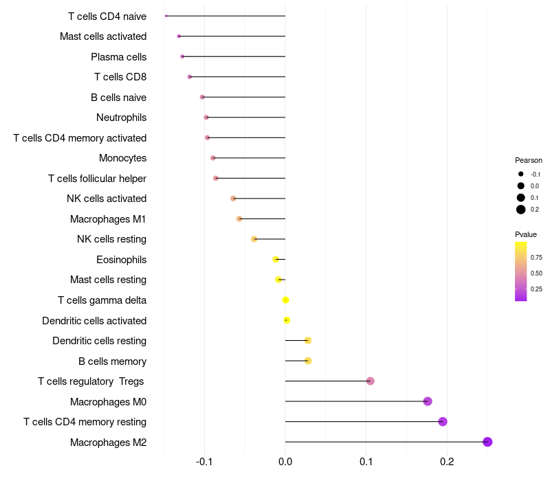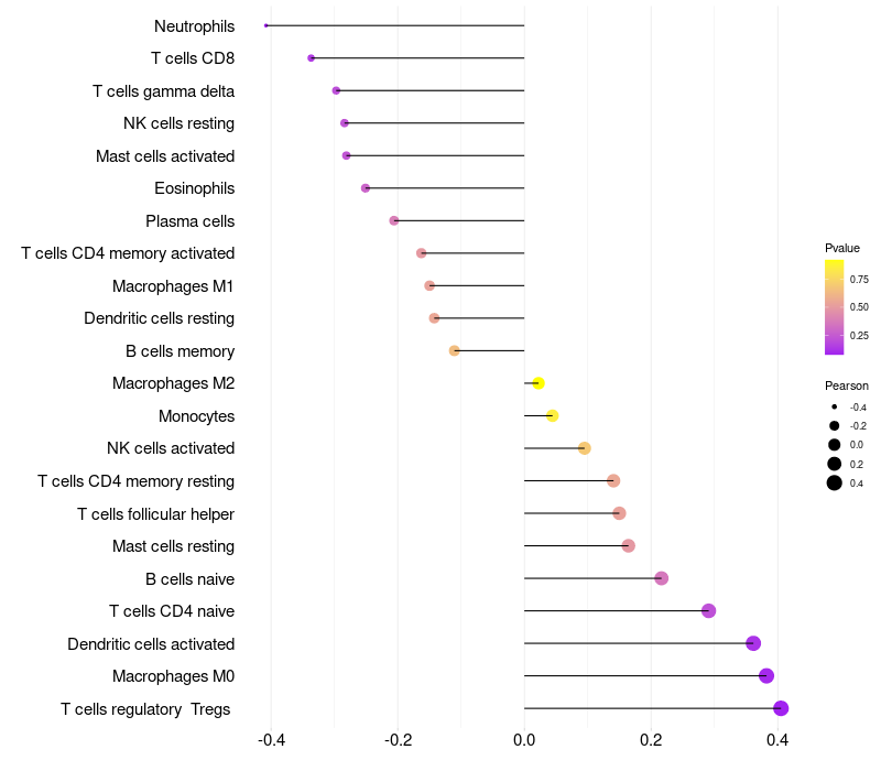 Lollipop of SEC14L4 expression and immune infiltrating cell level correlation result in HPV+ samples