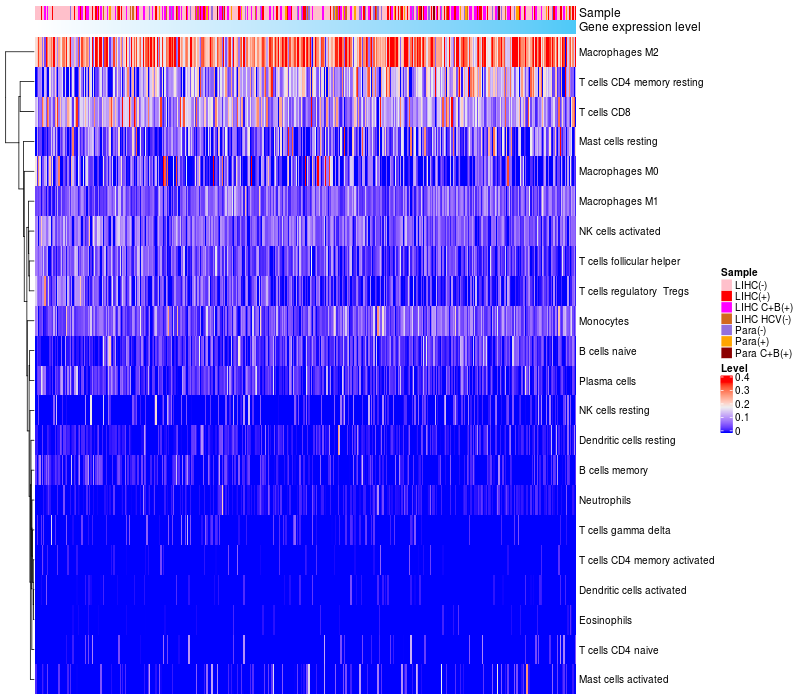 Liver hepatocellular carcinoma HCV (HBV+)(86), Liver hepatocellular carcinoma HCV (HBV-)(19), Liver hepatocellular carcinoma (HBV+)(209), Liver hepatocellular carcinoma (HBV+)(60), Paracancerous HCV (HBV+)(4), Paracancerous (HBV-)(28), Paracancerous (HBV+)(18) |