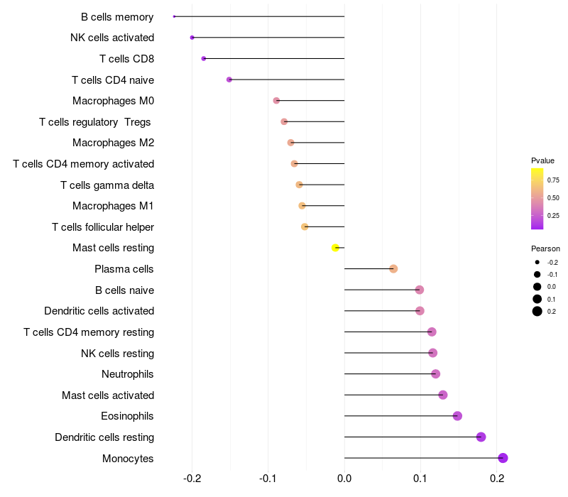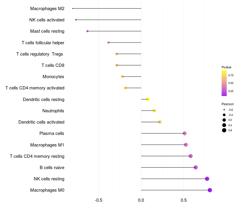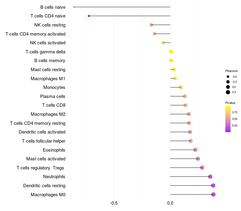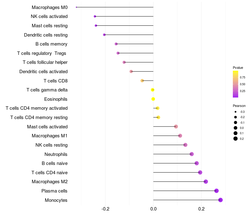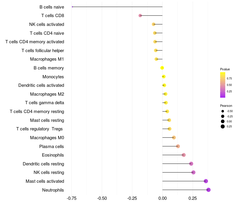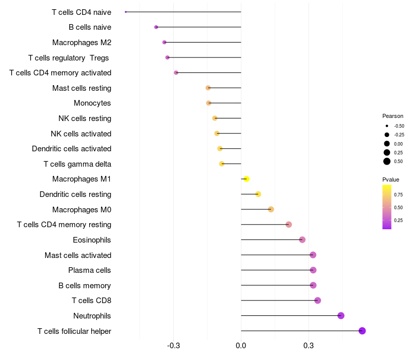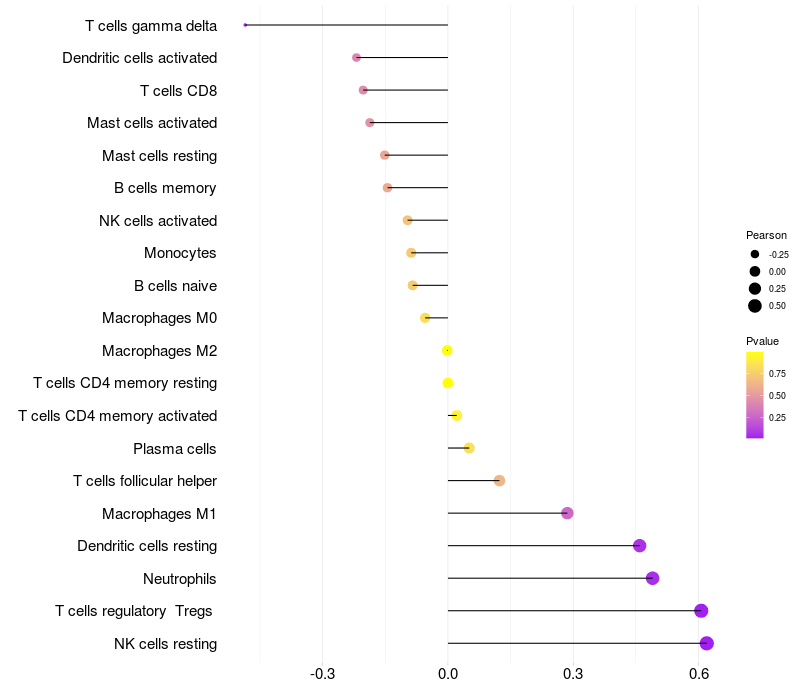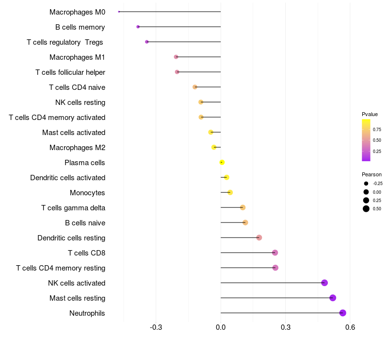 Lollipop of SERPINB3 expression and immune infiltrating cell level correlation result in HPV+ samples