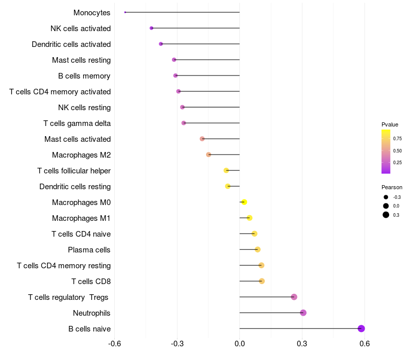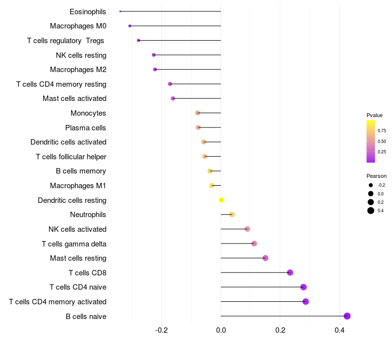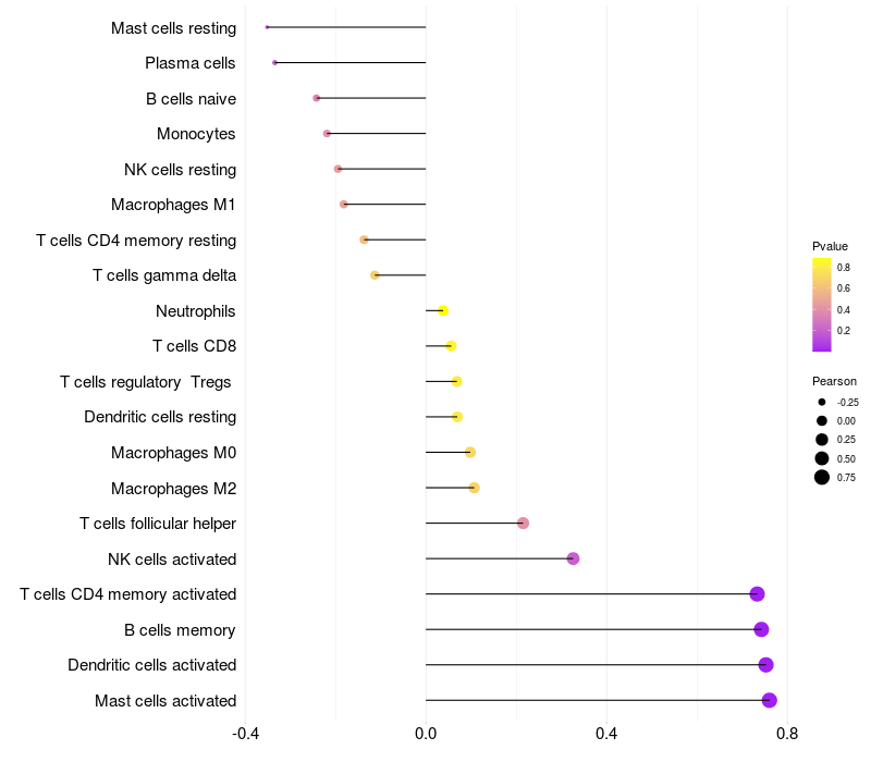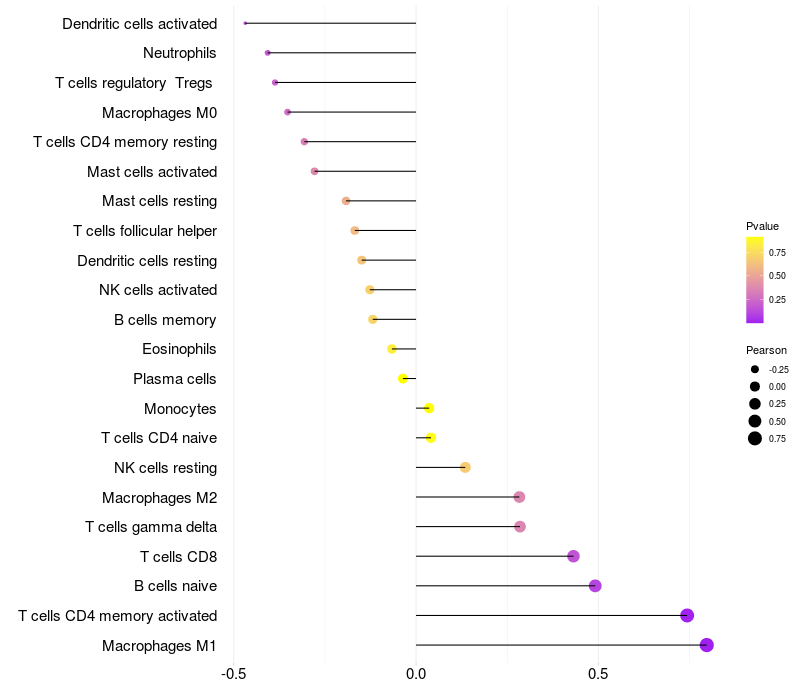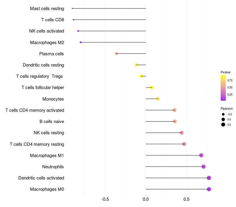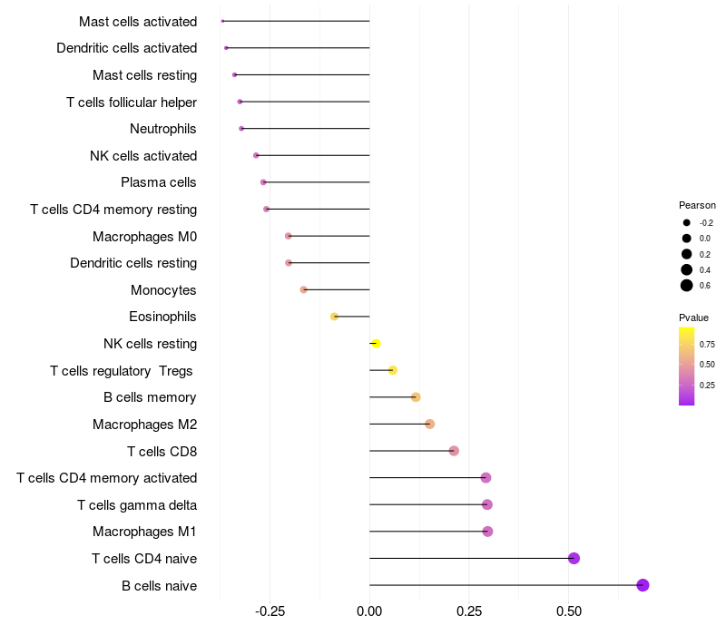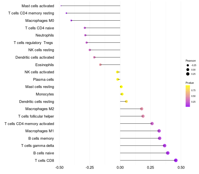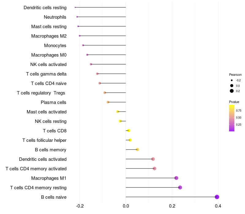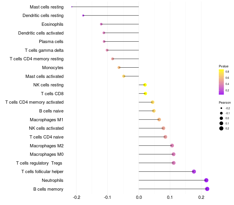 Lollipop of SERPINB9 expression and immune infiltrating cell level correlation result in HPV+ samples