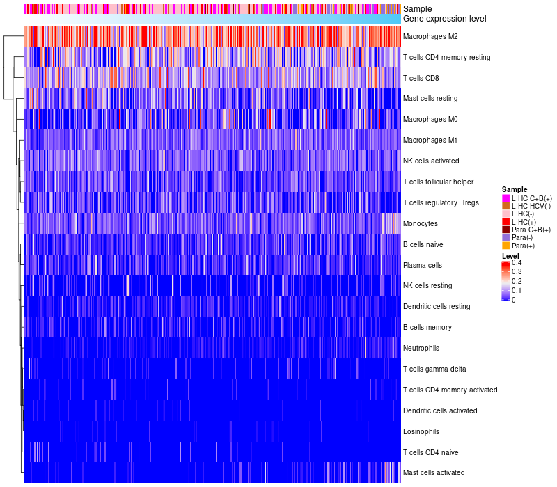 Liver hepatocellular carcinoma HCV (HBV+)(86), Liver hepatocellular carcinoma HCV (HBV-)(19), Liver hepatocellular carcinoma (HBV+)(209), Liver hepatocellular carcinoma (HBV+)(60), Paracancerous HCV (HBV+)(4), Paracancerous (HBV-)(28), Paracancerous (HBV+)(18) |