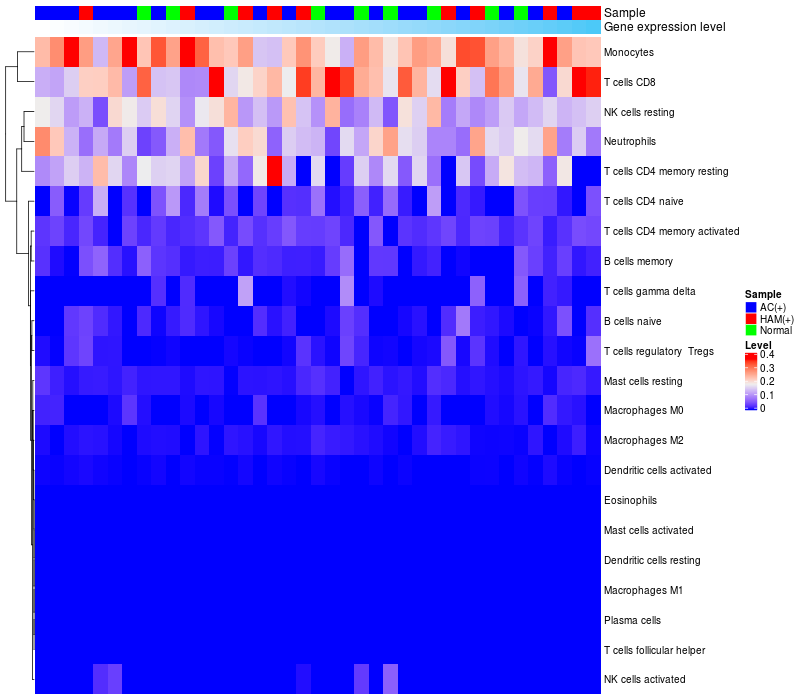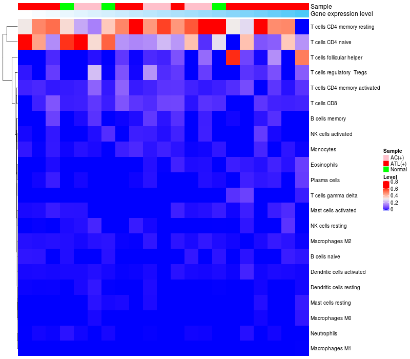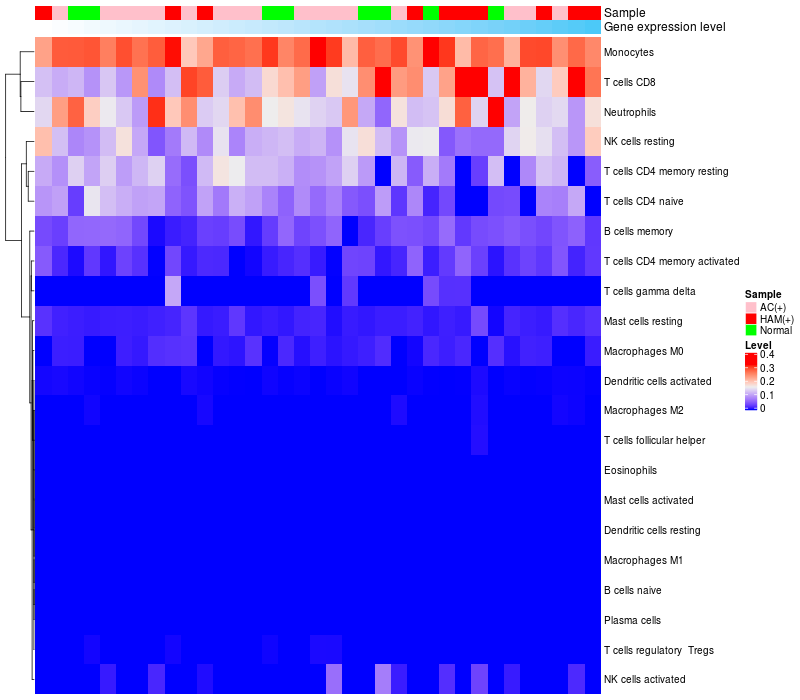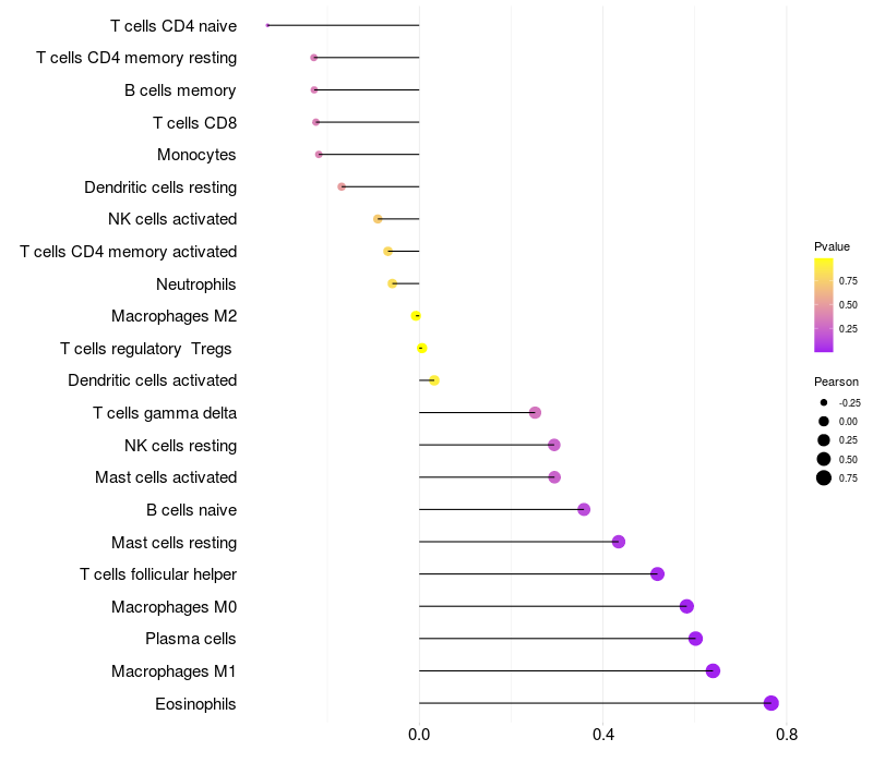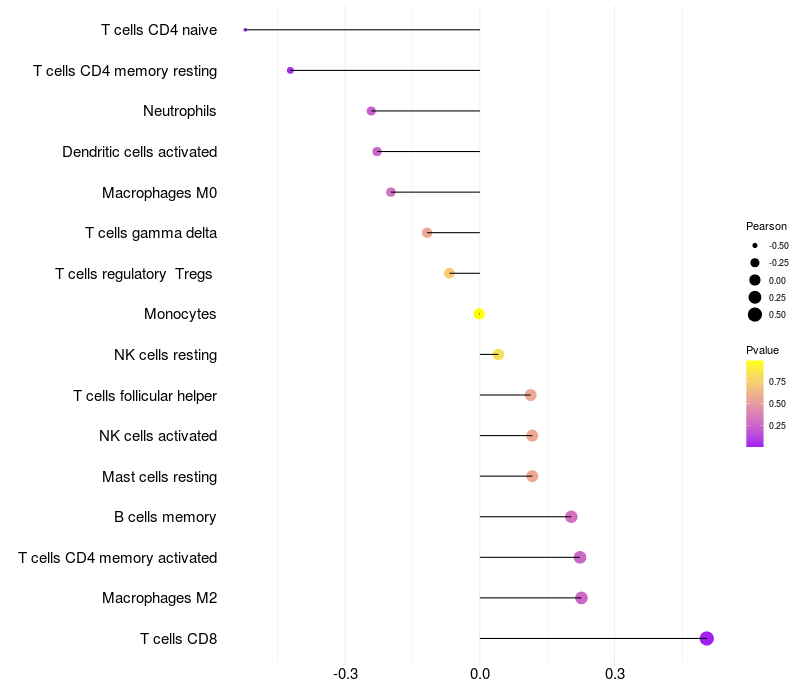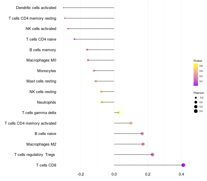 Lollipop of SESN2 expression and immune infiltrating cell level correlation result in HTLV1+ samples