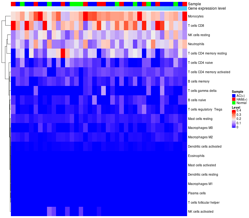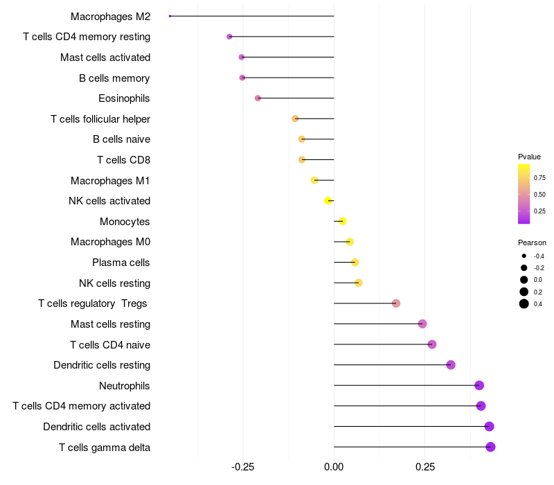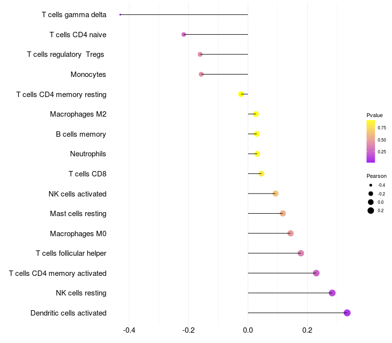 Lollipop of SGTB expression and immune infiltrating cell level correlation result in HTLV1+ samples