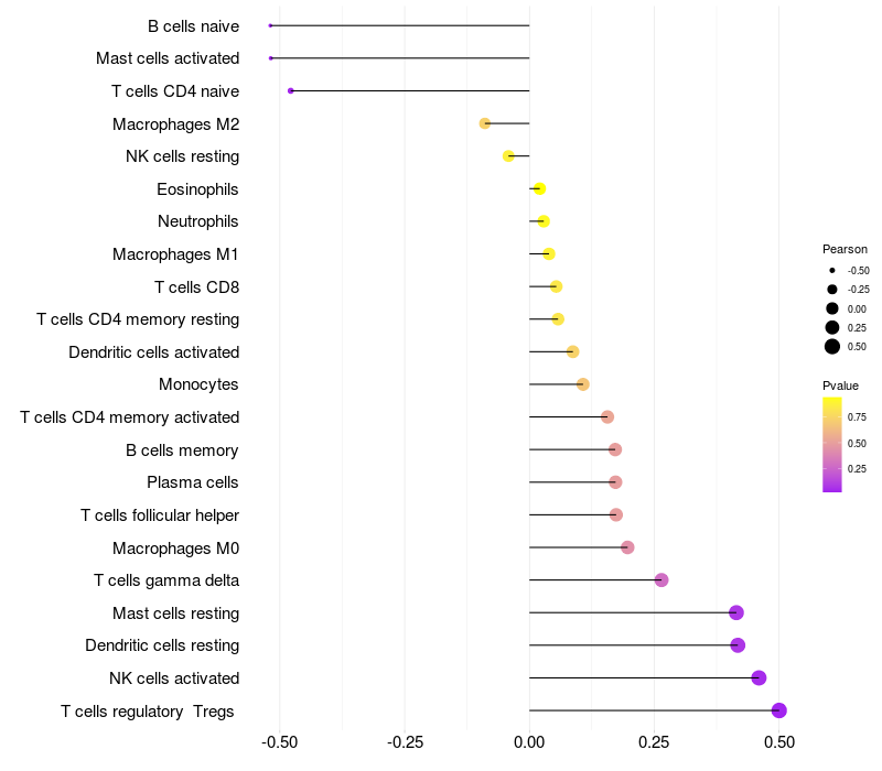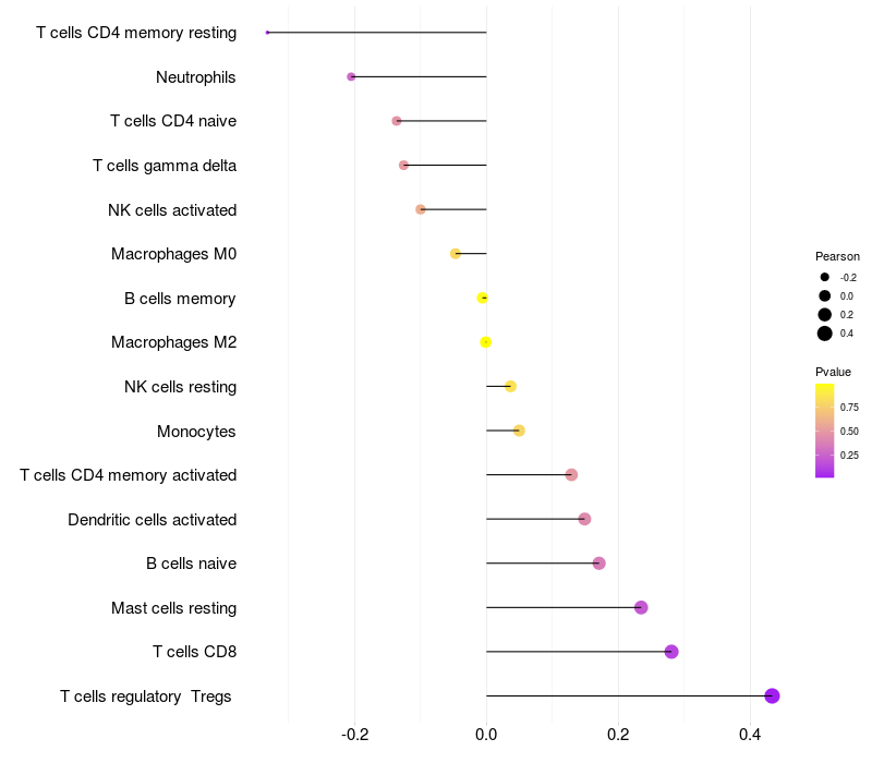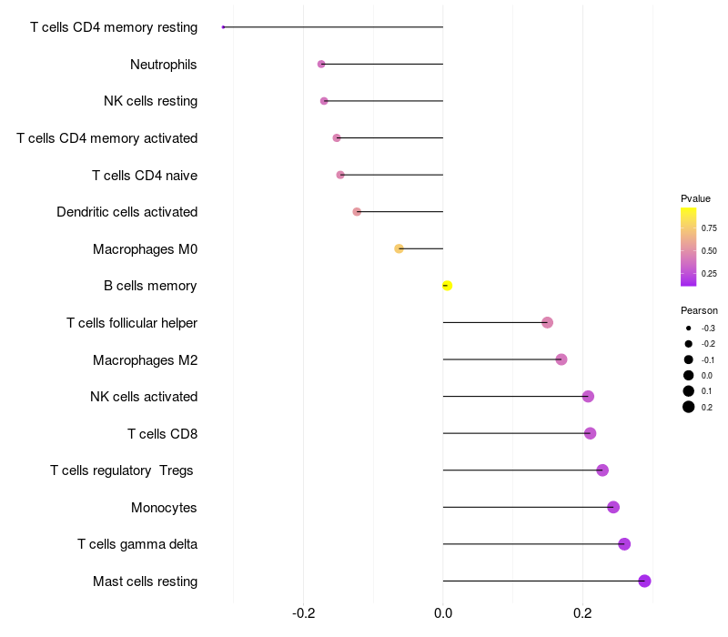 Lollipop of SH3BP1 expression and immune infiltrating cell level correlation result in HTLV1+ samples