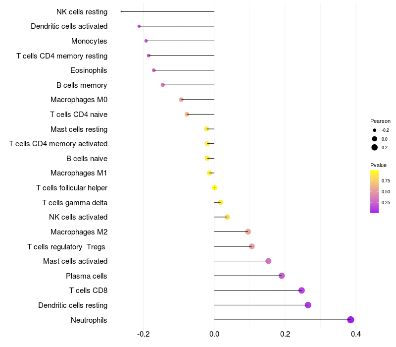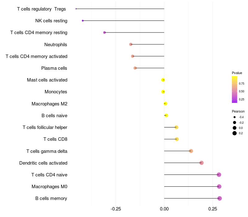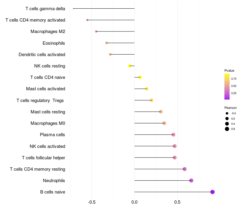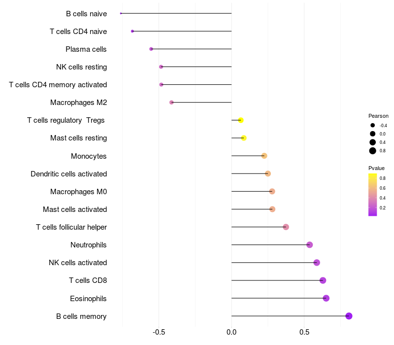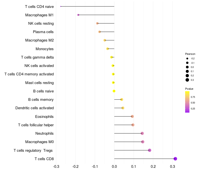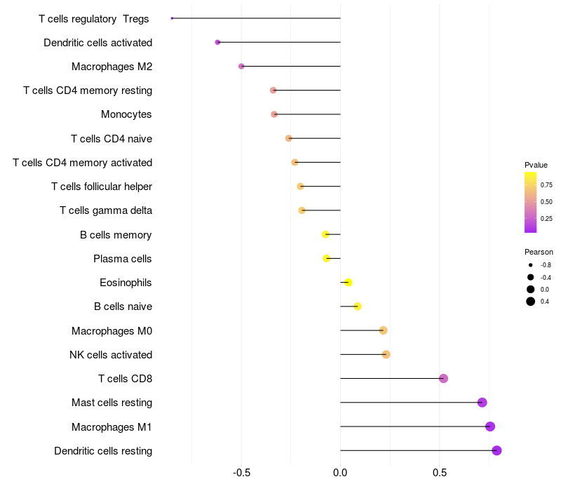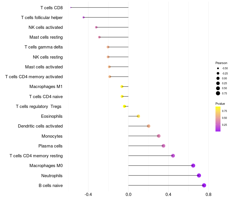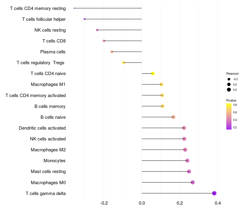 Lollipop of SH3BP2 expression and immune infiltrating cell level correlation result in EBV+ samples