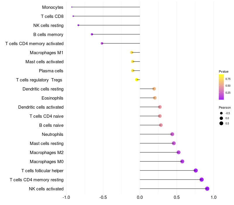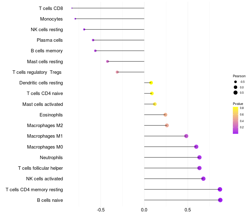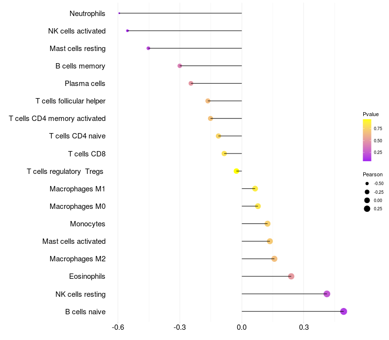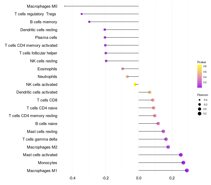 Lollipop of SH3D19 expression and immune infiltrating cell level correlation result in HBV+ Liver cirrhosis samples