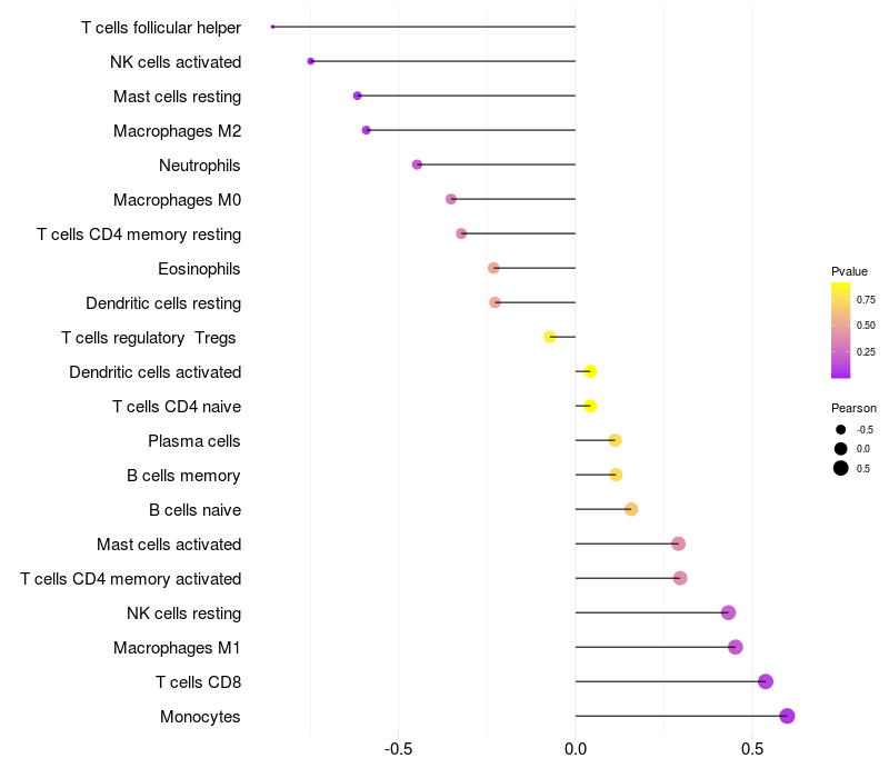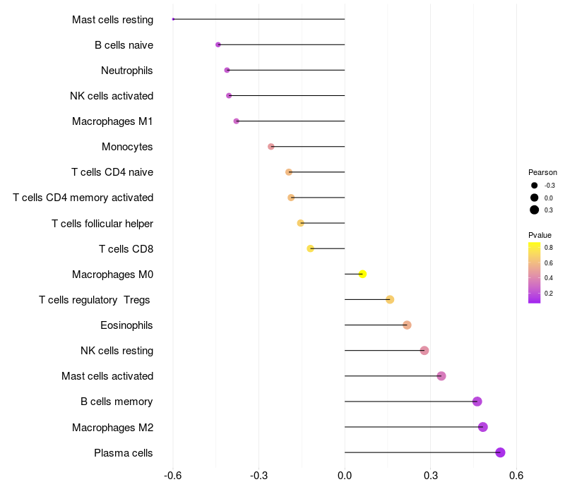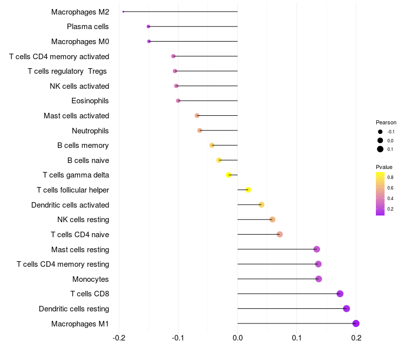 Lollipop of SHD expression and immune infiltrating cell level correlation result in HBV+ Liver cirrhosis samples