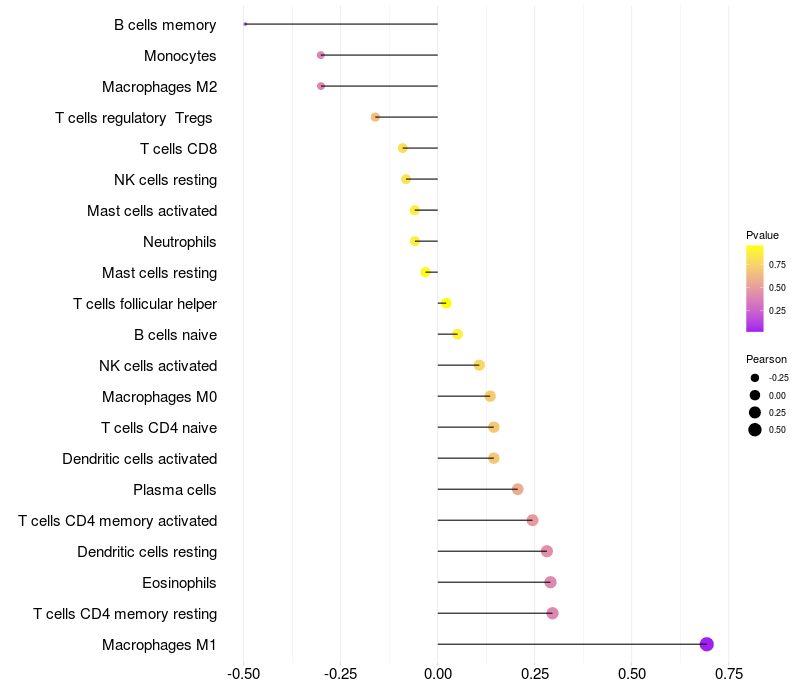 Lollipop of SHF expression and immune infiltrating cell level correlation result in HBV+ Liver cirrhosis samples
