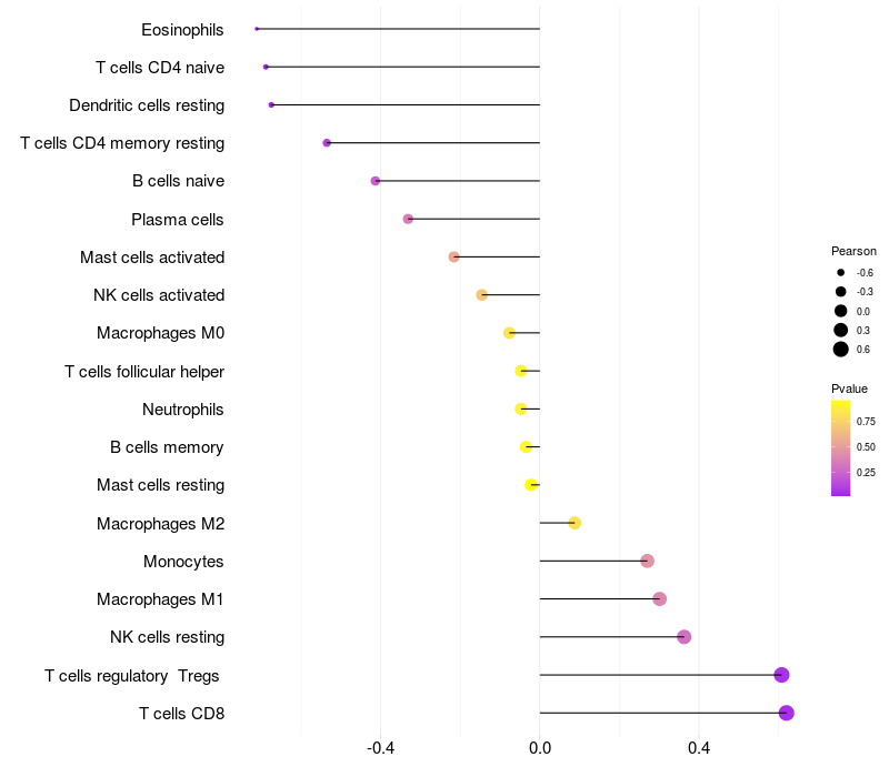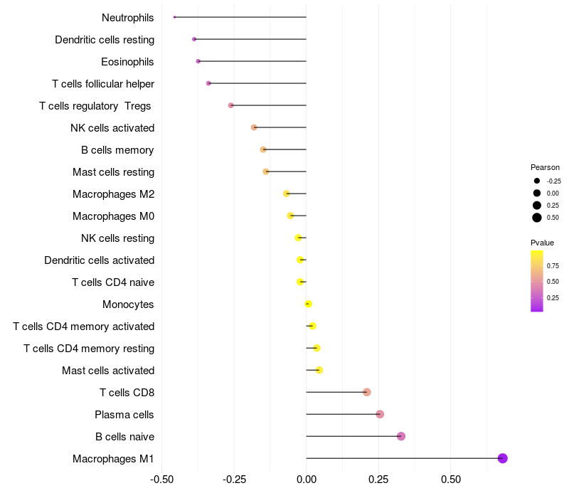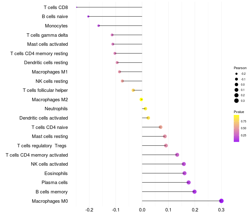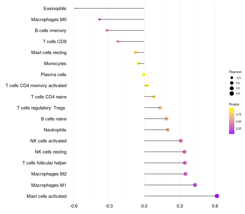 Lollipop of SIM2 expression and immune infiltrating cell level correlation result in HBV+ Liver cirrhosis samples
