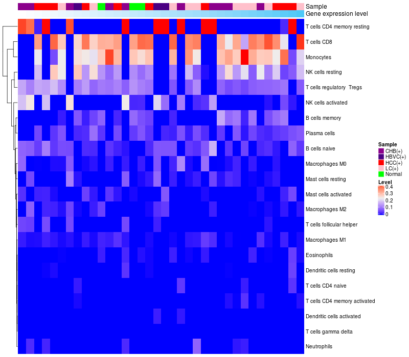 Chronic hepatitis B patients (HBV+)(10),Hepatocellular carcinoma (HBV+)(10),Liver cirrhosis(HBV+)(10),Normal(3),HBV carriers (3) |