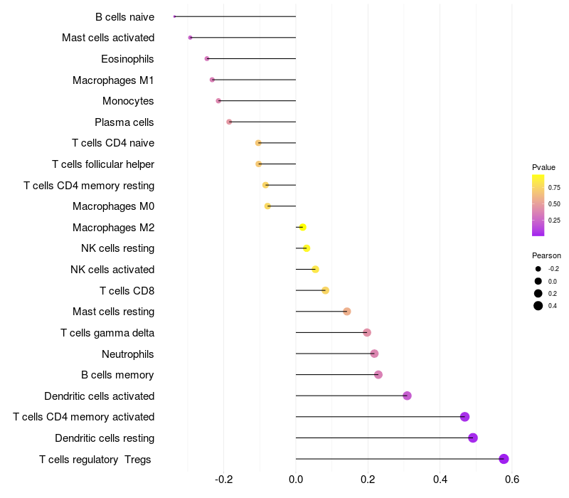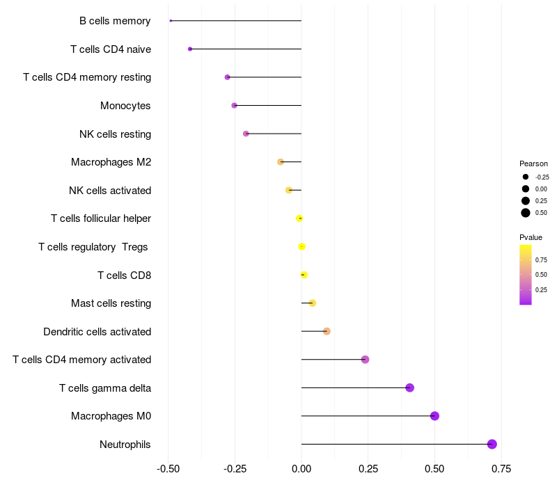Lollipop of SLA expression and immune infiltrating cell level correlation result in HTLV1+ samples