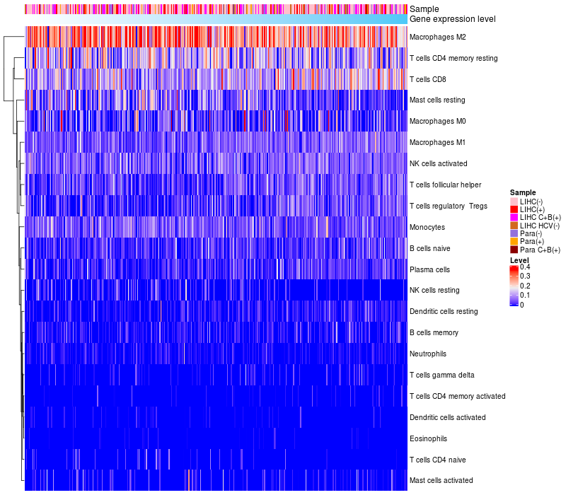 Liver hepatocellular carcinoma HCV (HBV+)(86), Liver hepatocellular carcinoma HCV (HBV-)(19), Liver hepatocellular carcinoma (HBV+)(209), Liver hepatocellular carcinoma (HBV+)(60), Paracancerous HCV (HBV+)(4), Paracancerous (HBV-)(28), Paracancerous (HBV+)(18) |