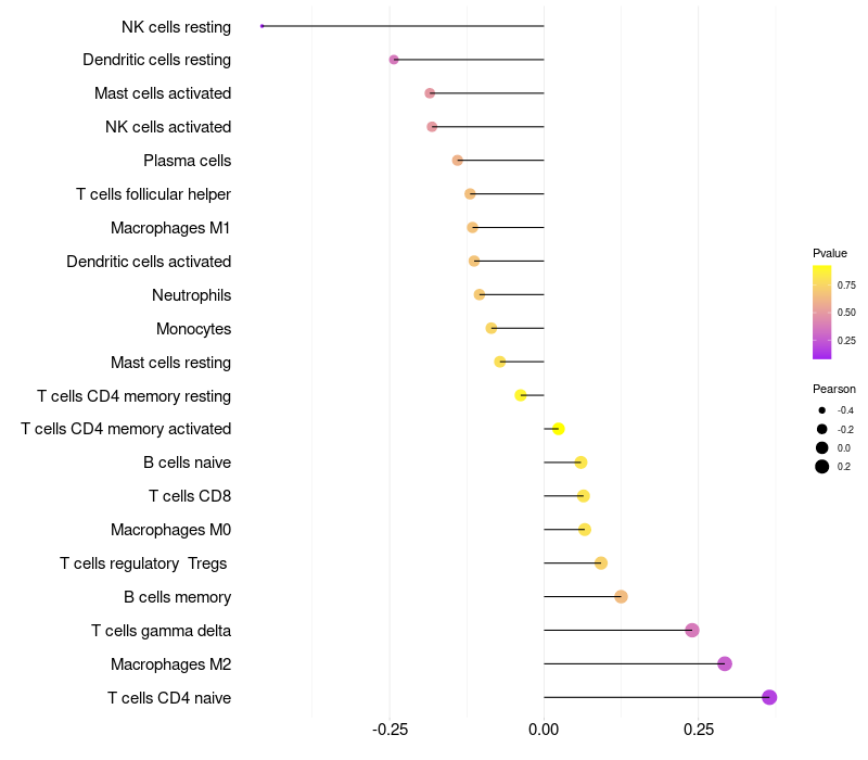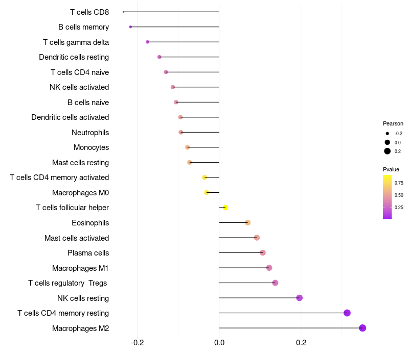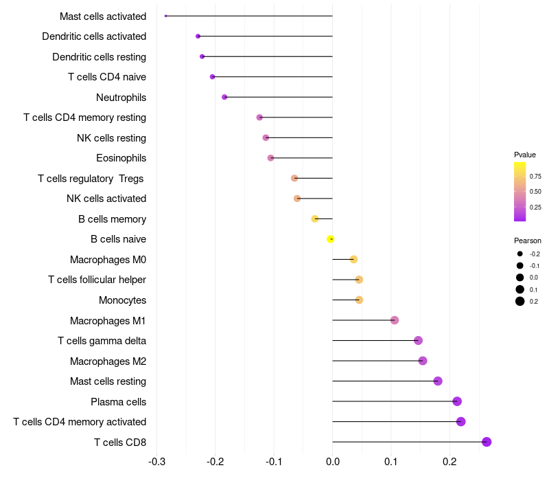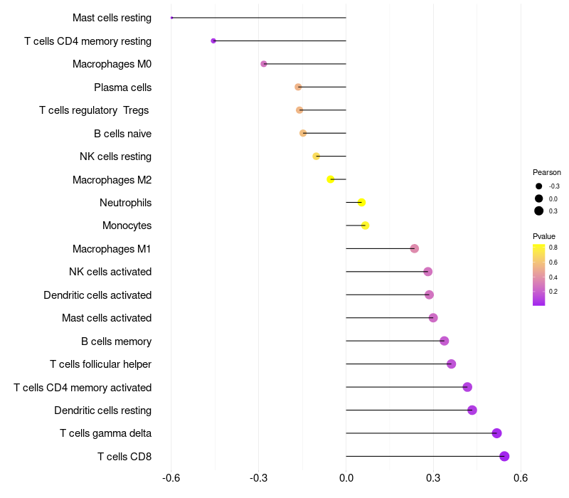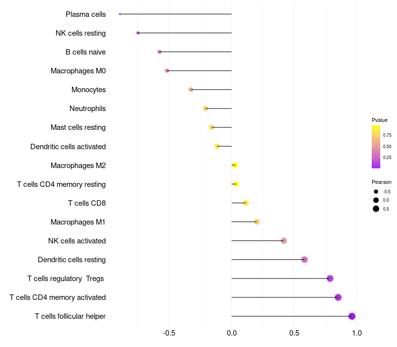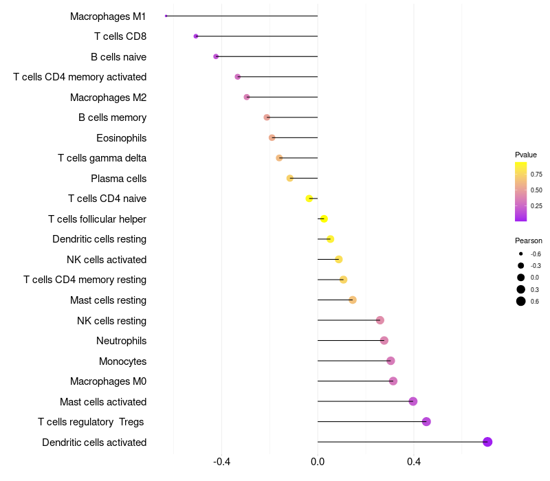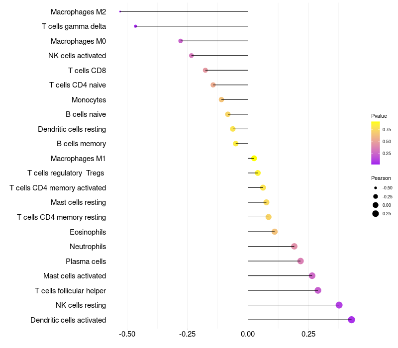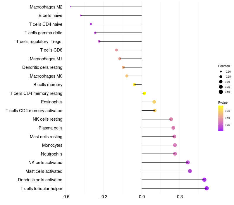 Lollipop of SLC13A2 expression and immune infiltrating cell level correlation result in HPV+ samples