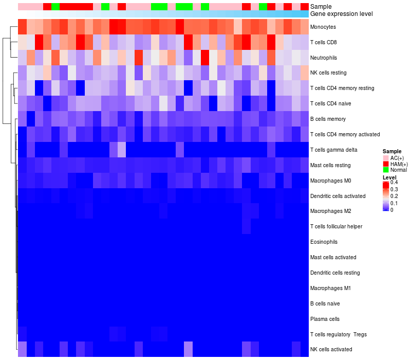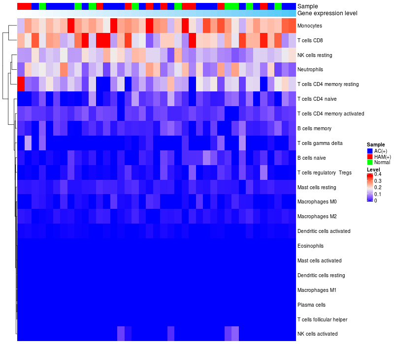 Normal (8), Asymptomatic carriers (HTLV1+)(17), HTLV-1-associated myelopathy (HTLV1+)(10) |