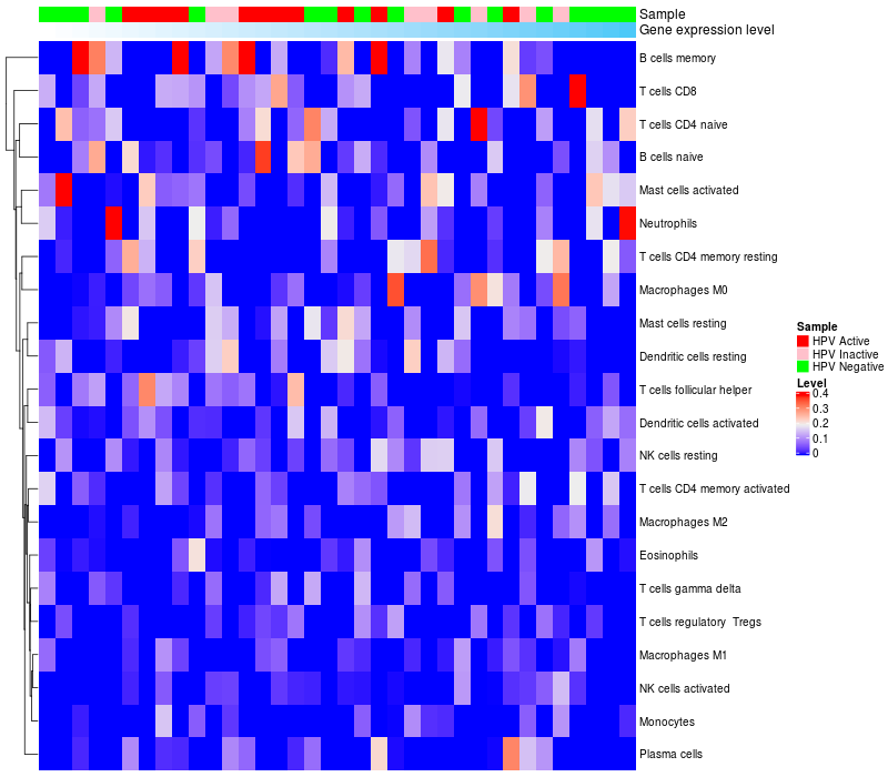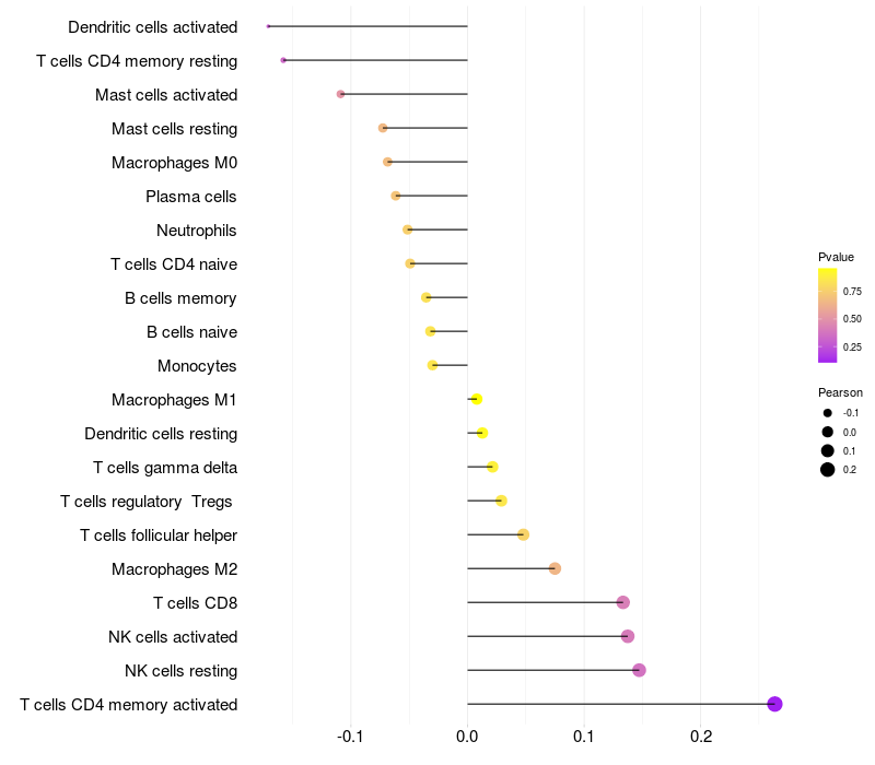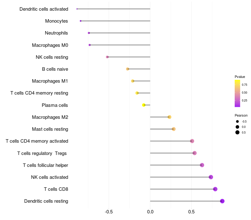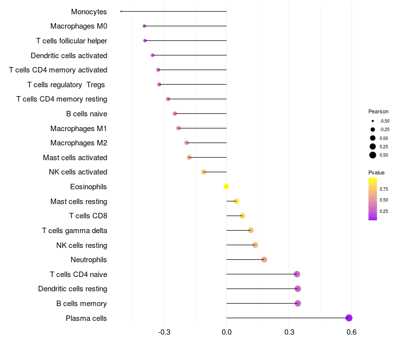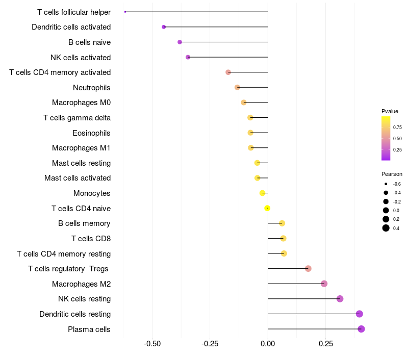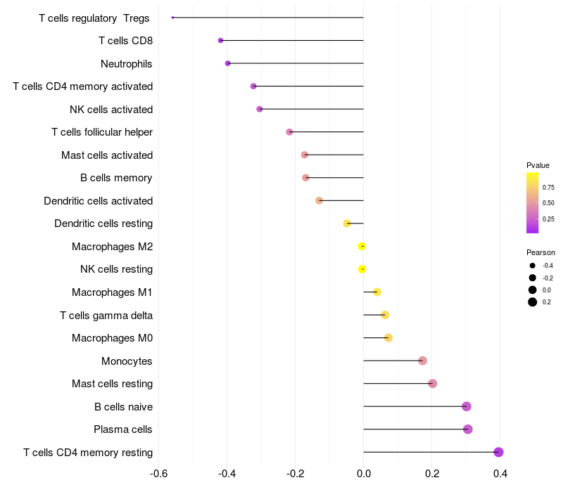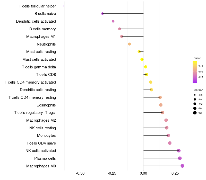 Lollipop of SLC17A3 expression and immune infiltrating cell level correlation result in HPV+ samples