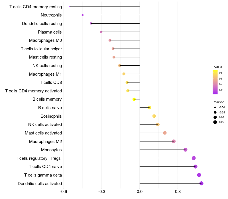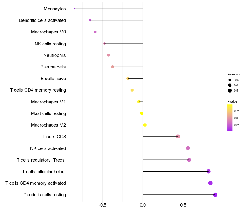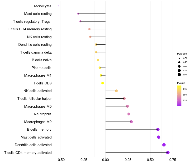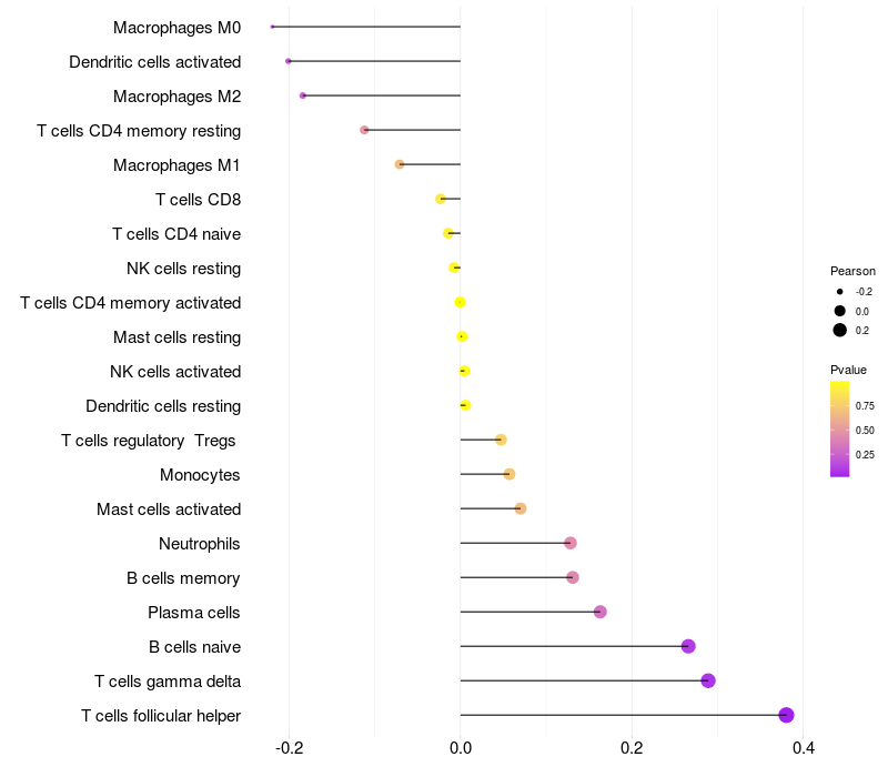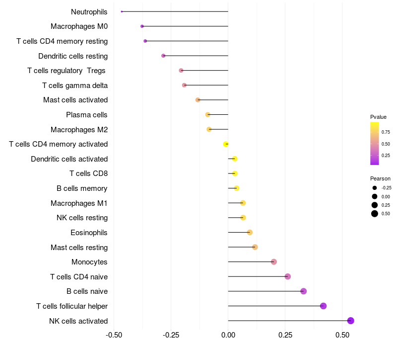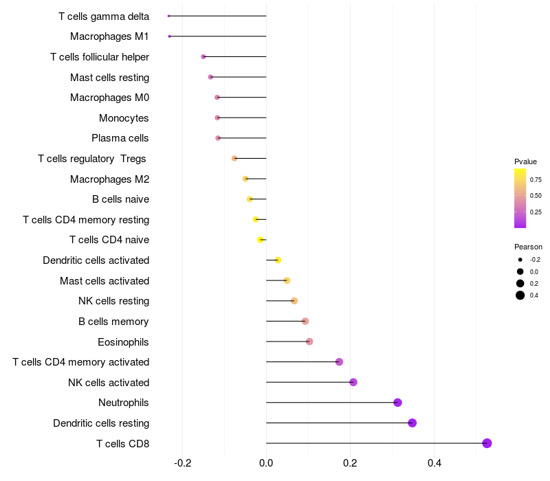 Lollipop of SLC22A7 expression and immune infiltrating cell level correlation result in HPV+ samples