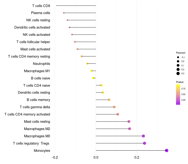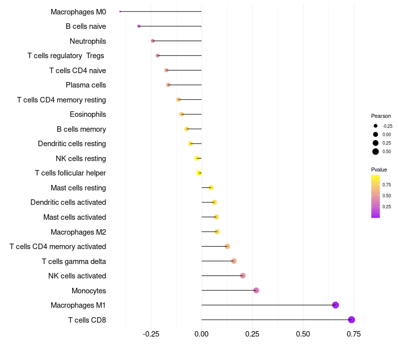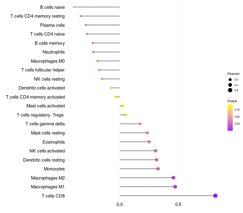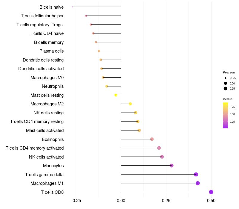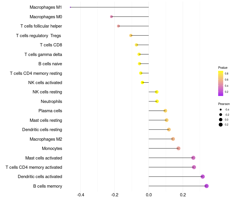 Lollipop of SLC25A2 expression and immune infiltrating cell level correlation result in HPV+ samples