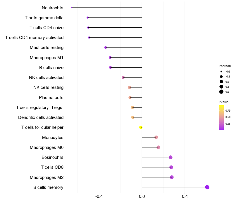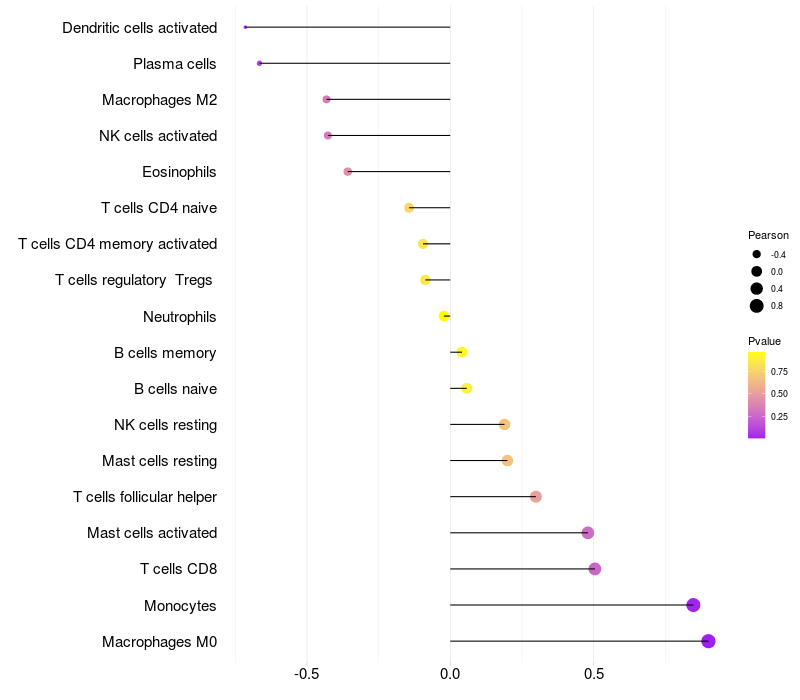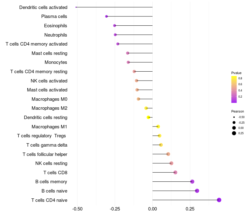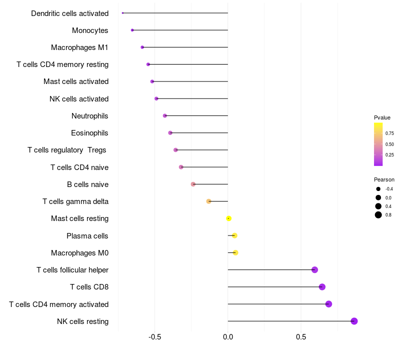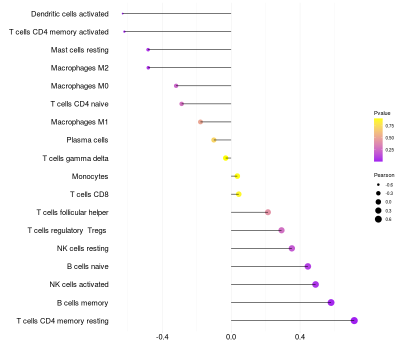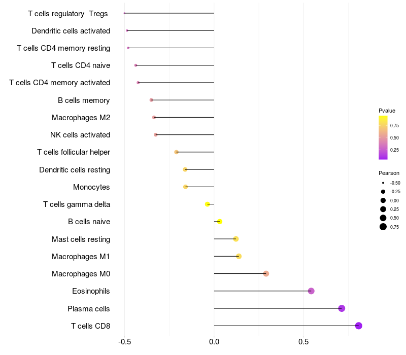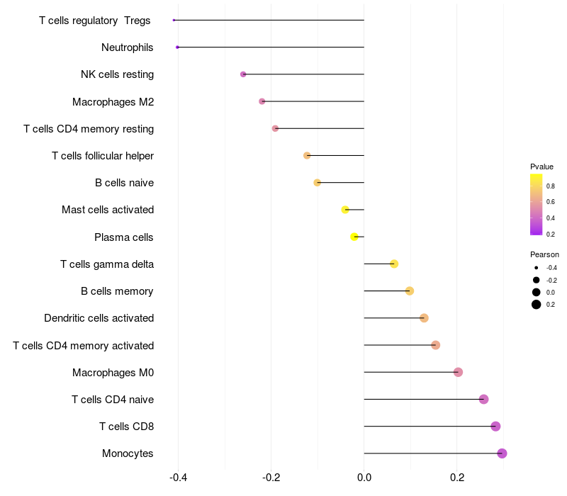 Lollipop of SLC25A42 expression and immune infiltrating cell level correlation result in EBV+ samples