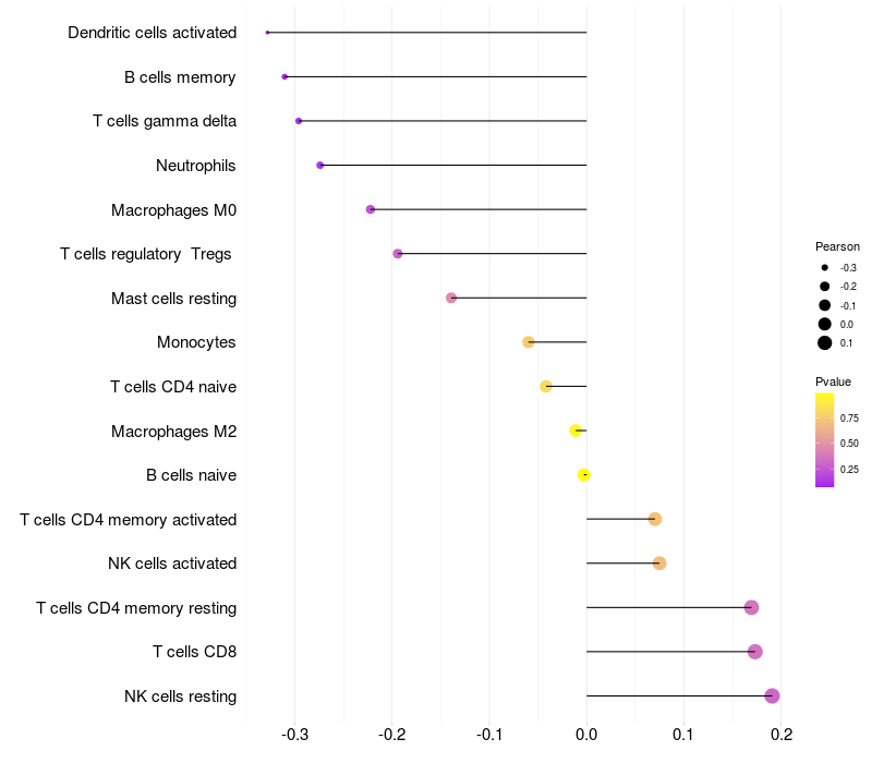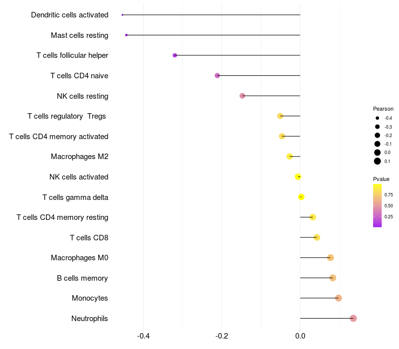 Lollipop of SLC28A3 expression and immune infiltrating cell level correlation result in HTLV1+ samples