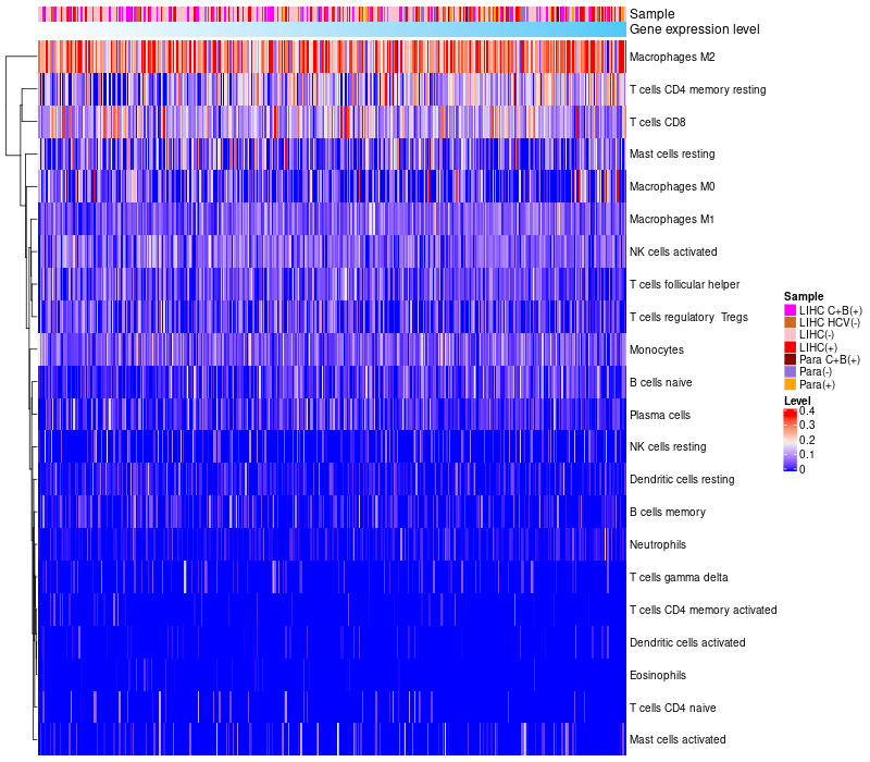 Liver hepatocellular carcinoma HCV (HBV+)(86), Liver hepatocellular carcinoma HCV (HBV-)(19), Liver hepatocellular carcinoma (HBV+)(209), Liver hepatocellular carcinoma (HBV+)(60), Paracancerous HCV (HBV+)(4), Paracancerous (HBV-)(28), Paracancerous (HBV+)(18) |