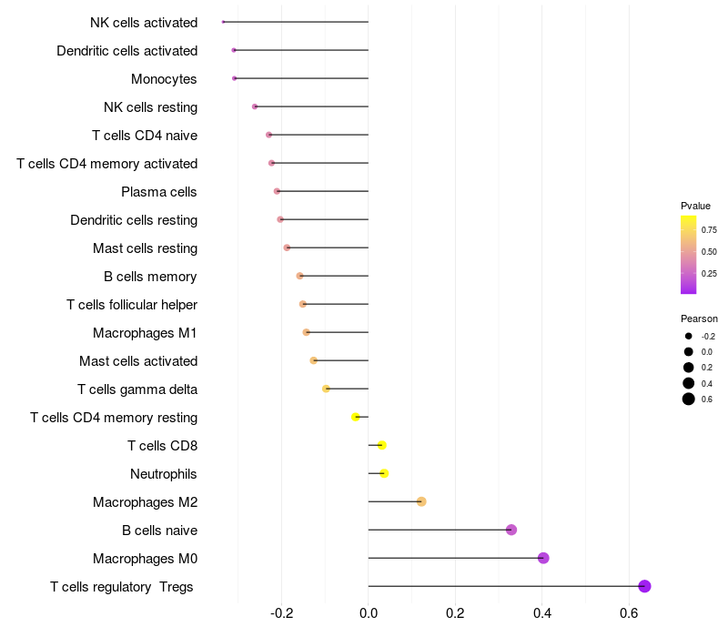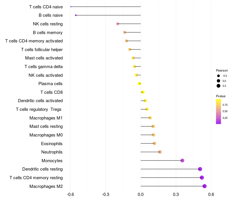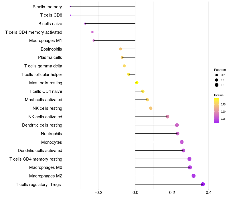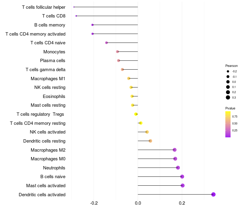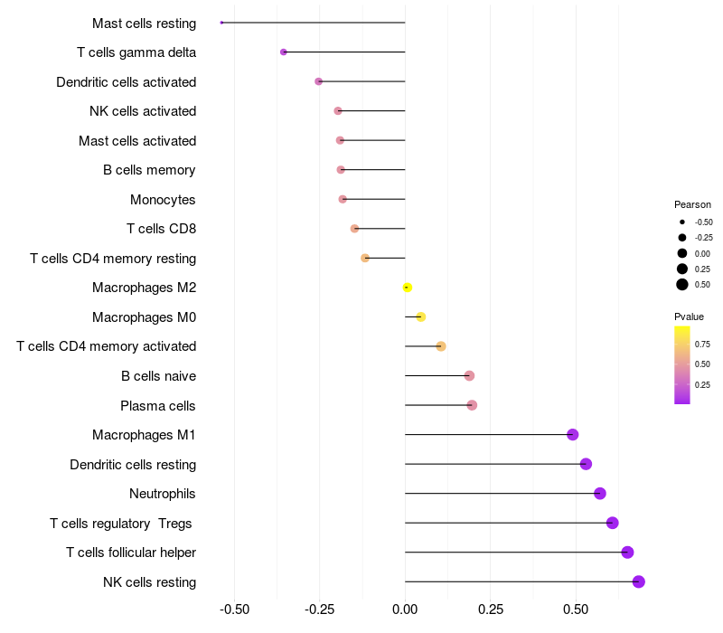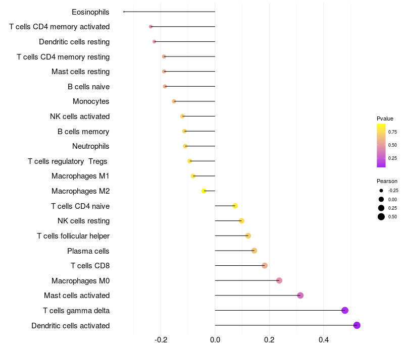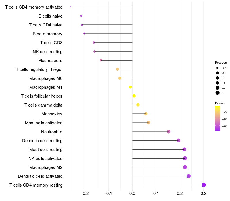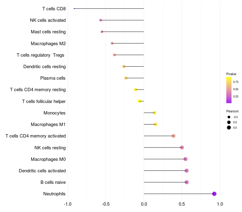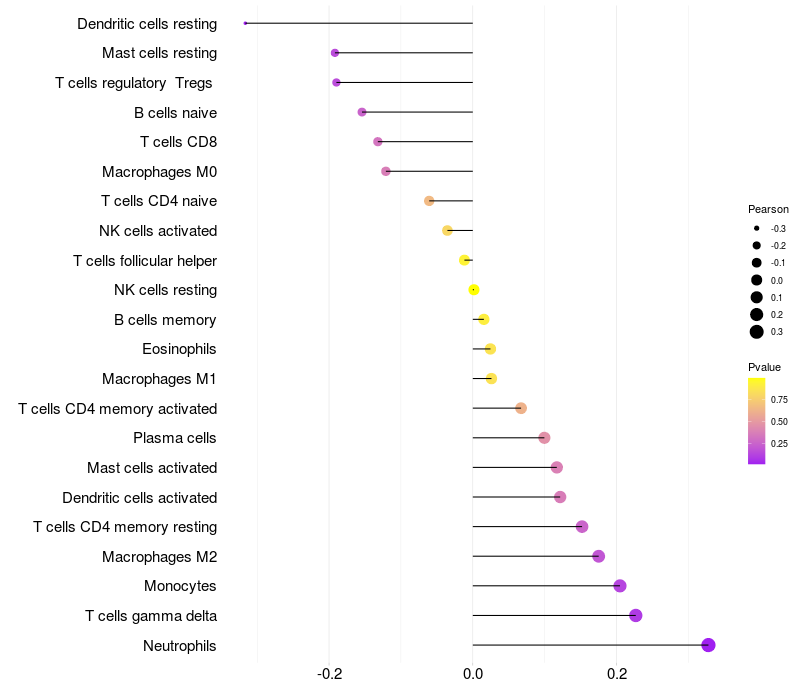 Lollipop of SLC2A9 expression and immune infiltrating cell level correlation result in HPV+ samples