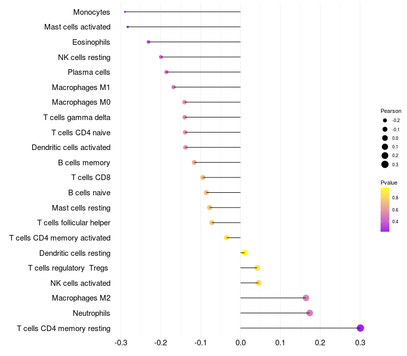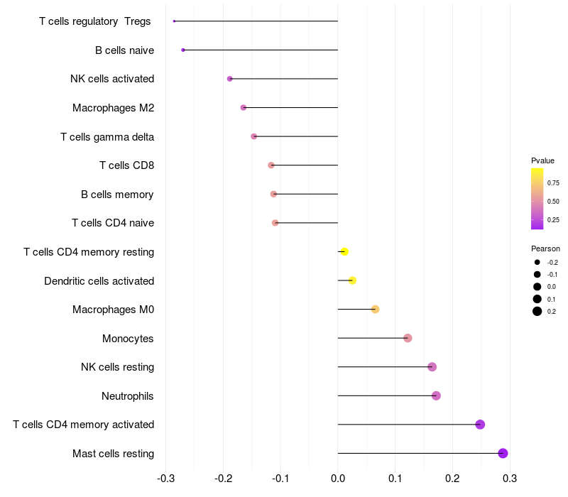 Lollipop of SLC34A2 expression and immune infiltrating cell level correlation result in HTLV1+ samples