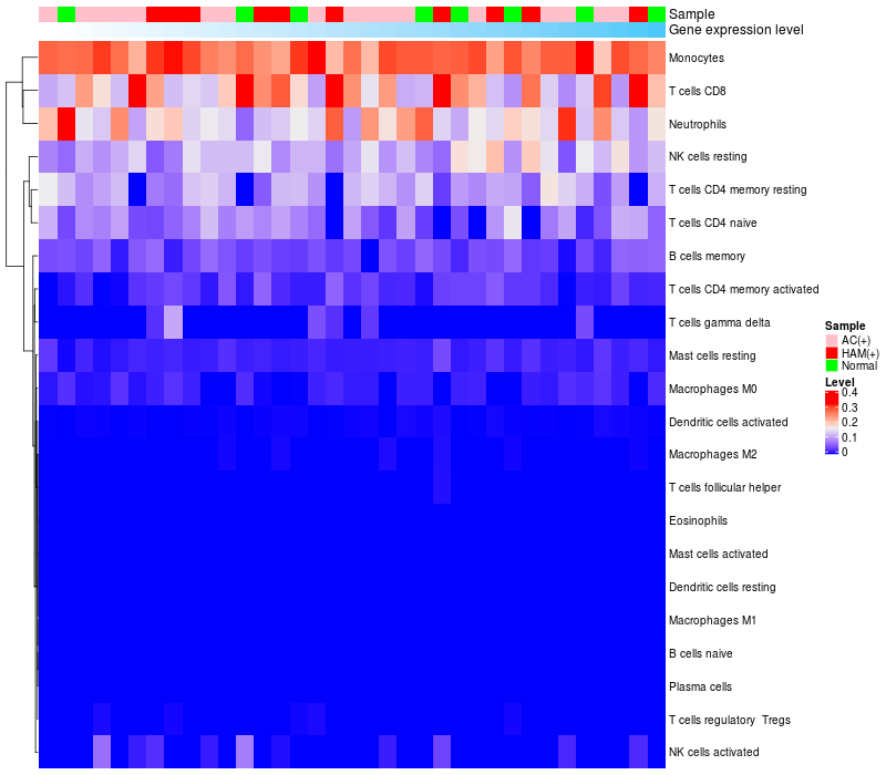 Normal (8), Asymptomatic carriers (HTLV1+)(17), HTLV-1-associated myelopathy (HTLV1+)(10) |