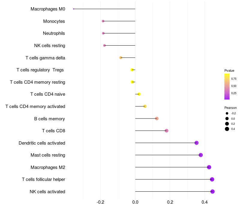 Lollipop of SLC35B4 expression and immune infiltrating cell level correlation result in HTLV1+ samples