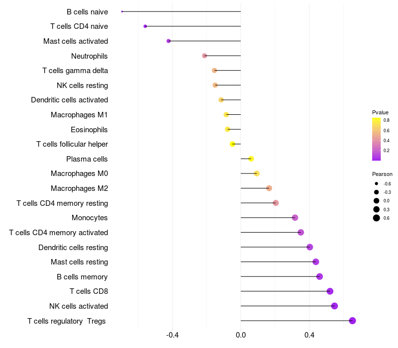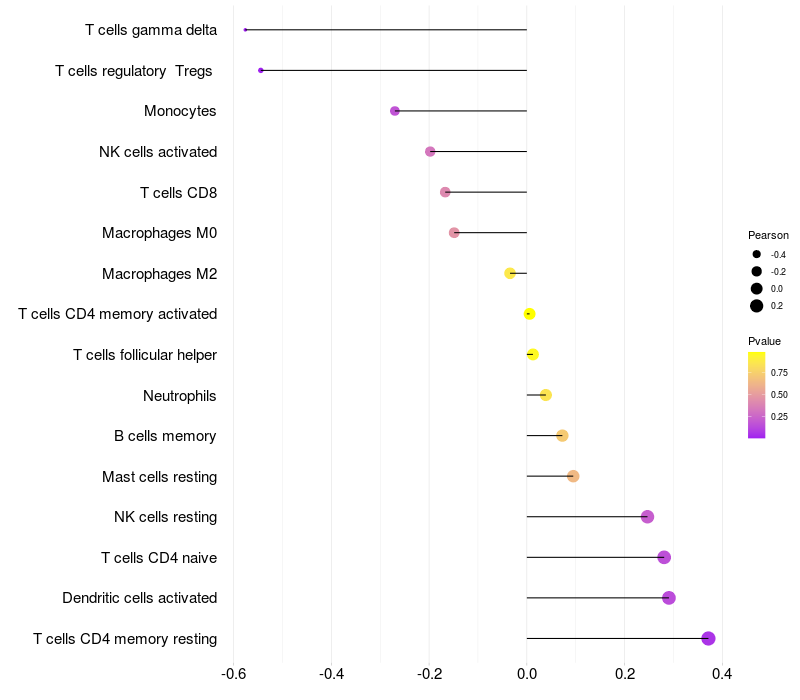 Lollipop of SLC35E1 expression and immune infiltrating cell level correlation result in HTLV1+ samples