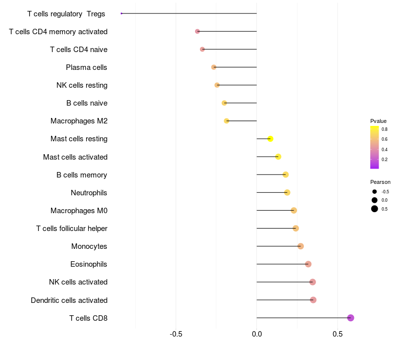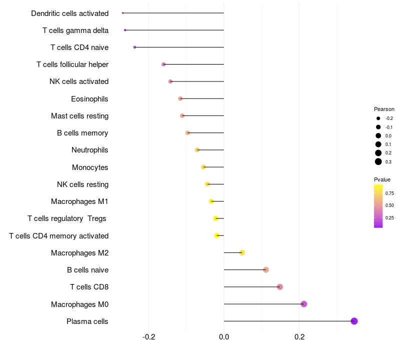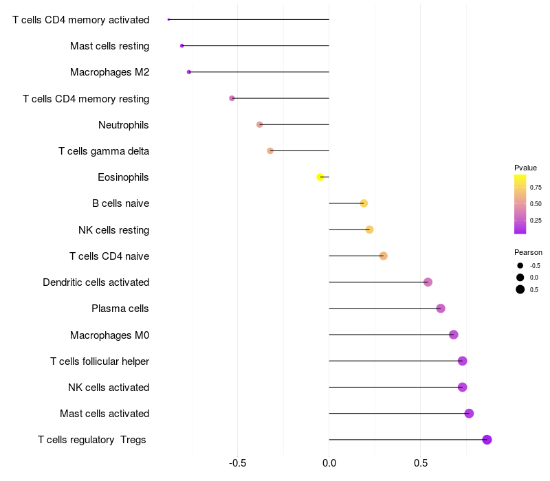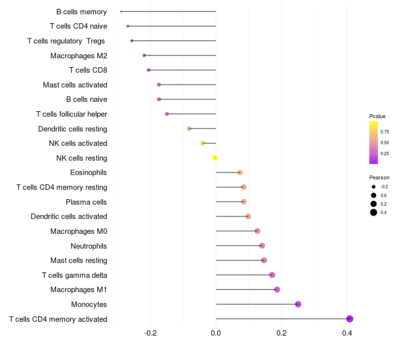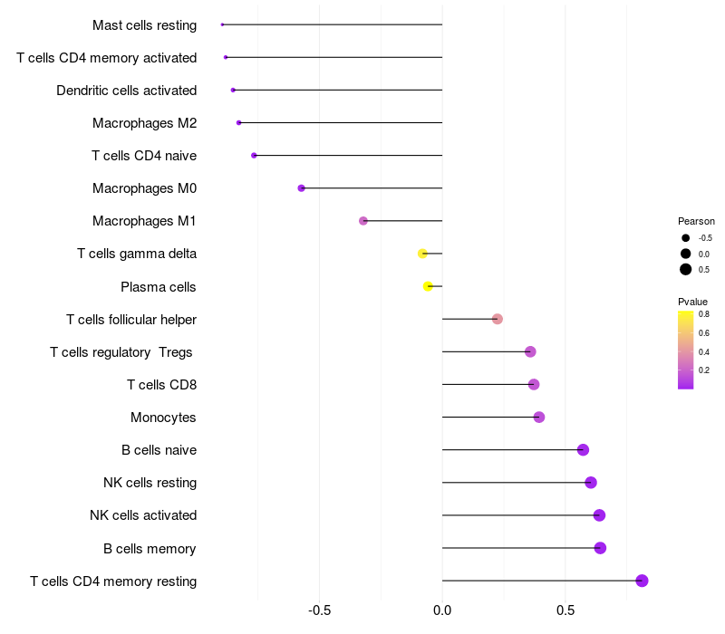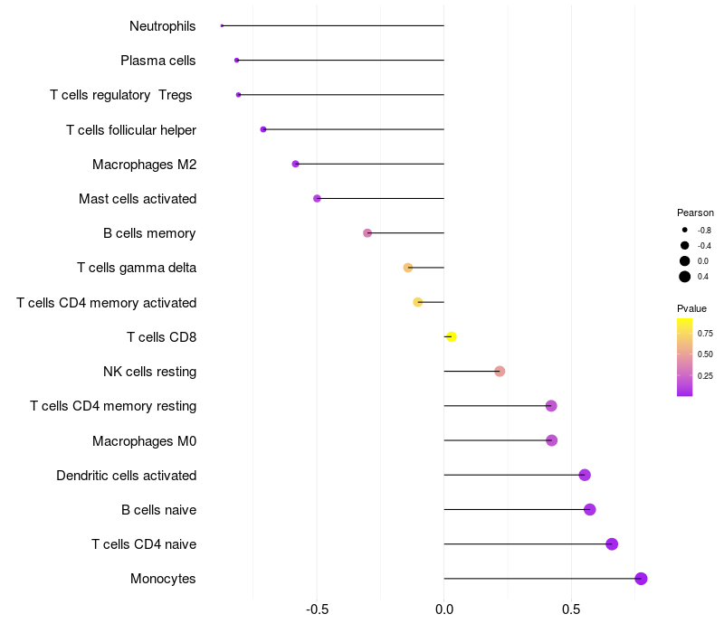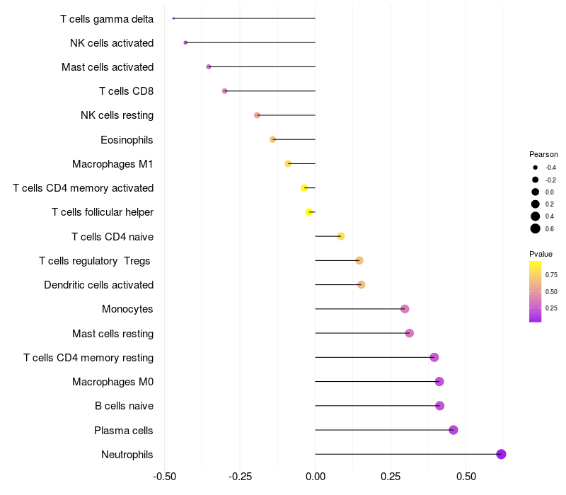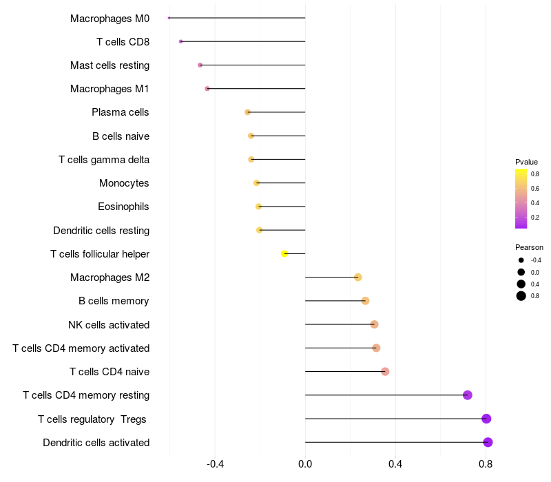 Lollipop of SLC38A2 expression and immune infiltrating cell level correlation result in EBV+ samples