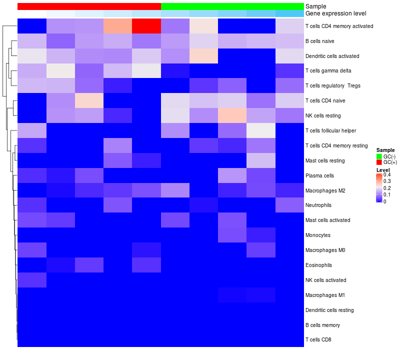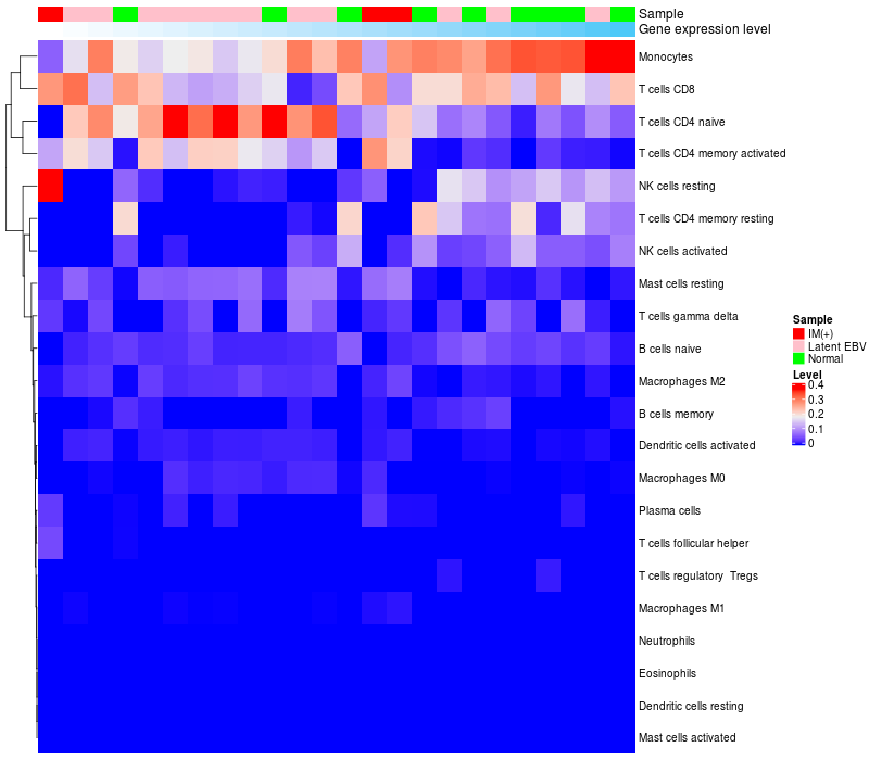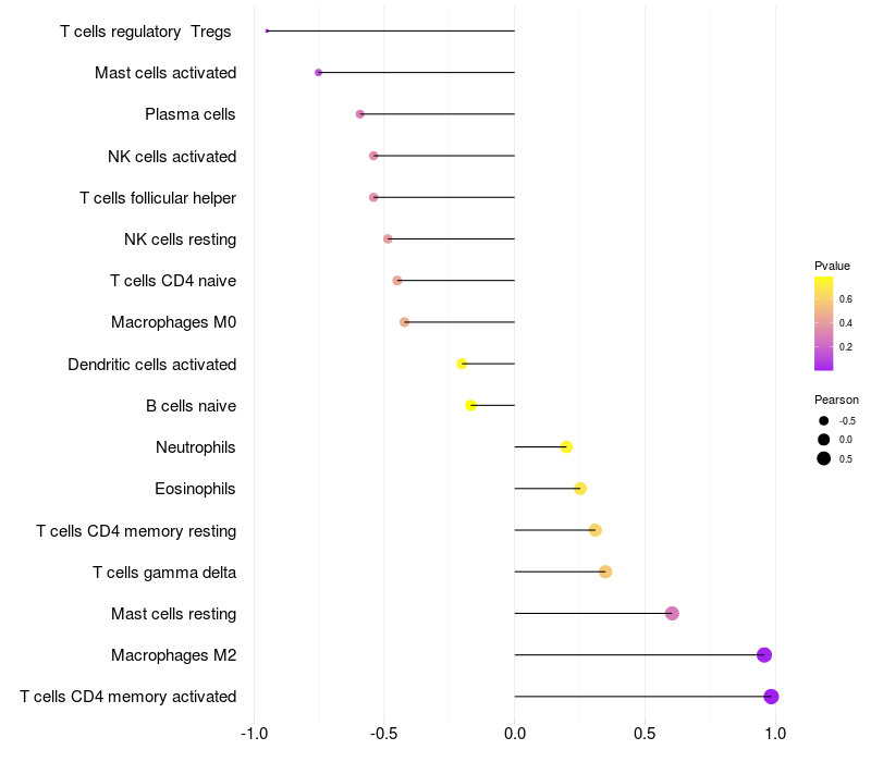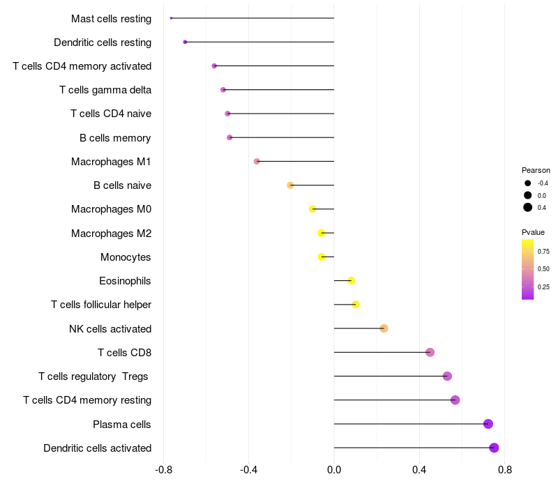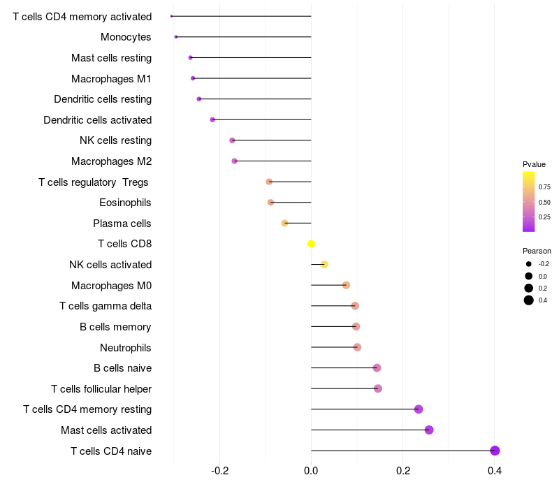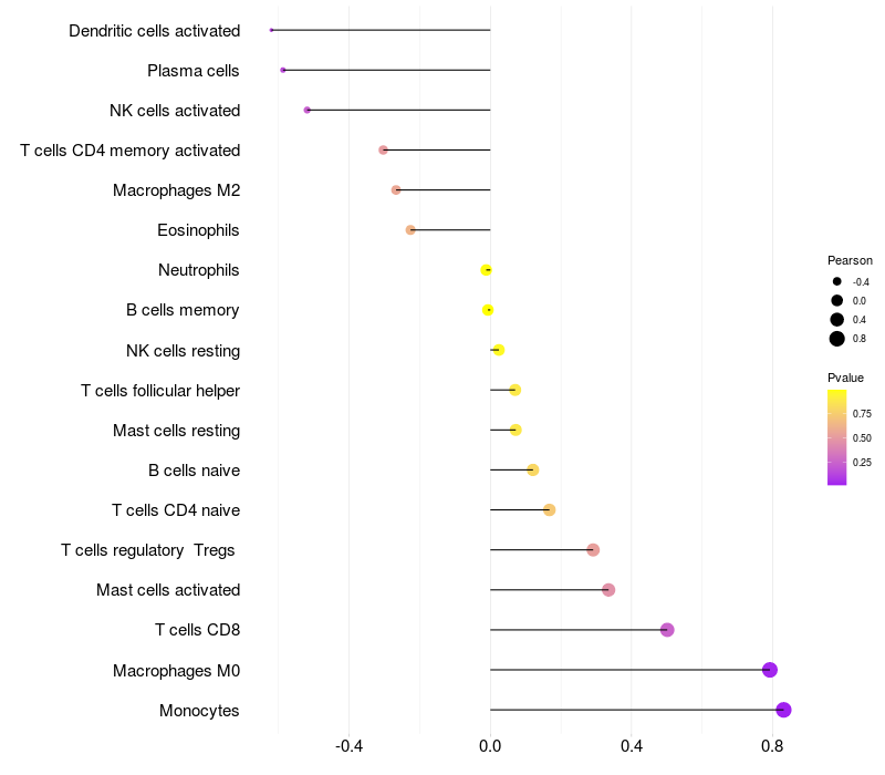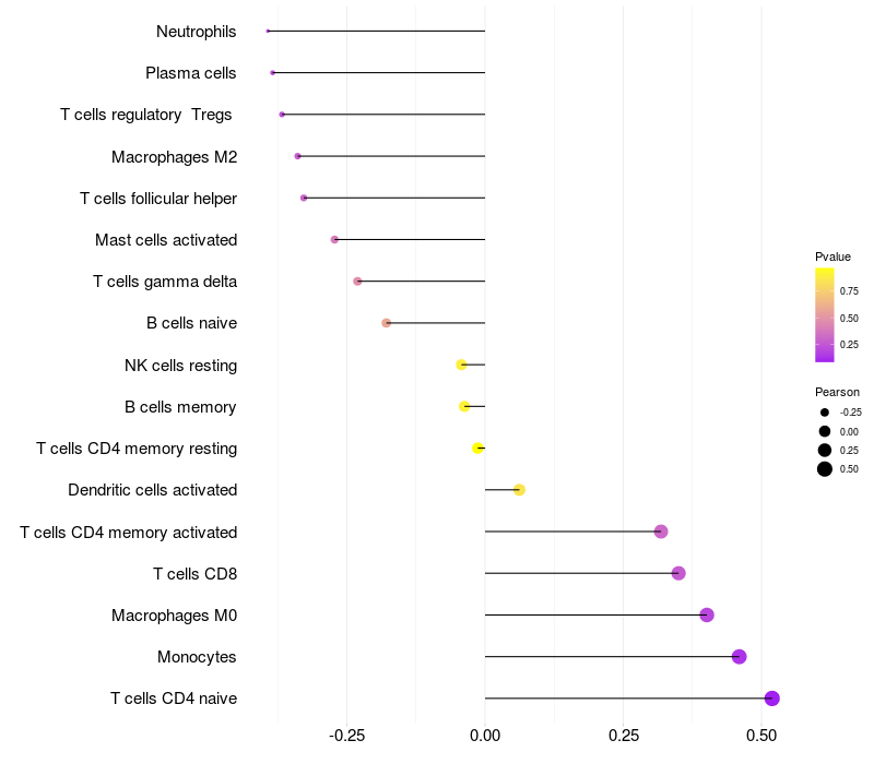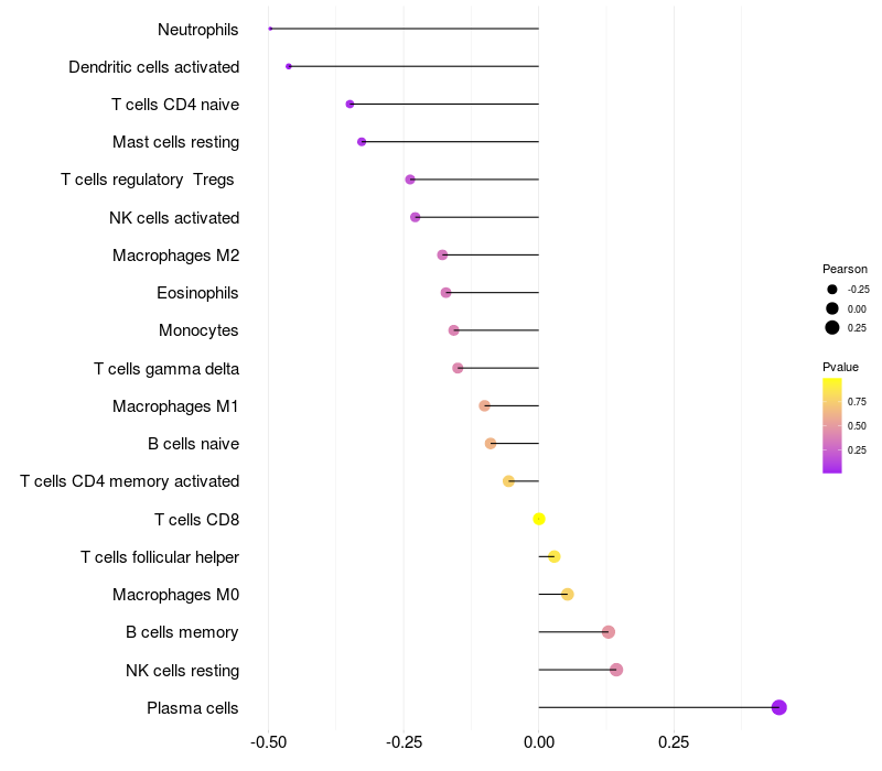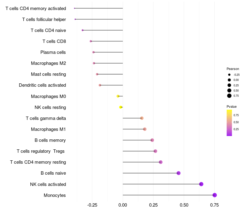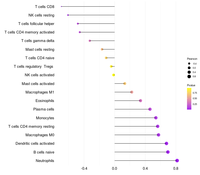 Lollipop of SLC43A2 expression and immune infiltrating cell level correlation result in EBV+ samples